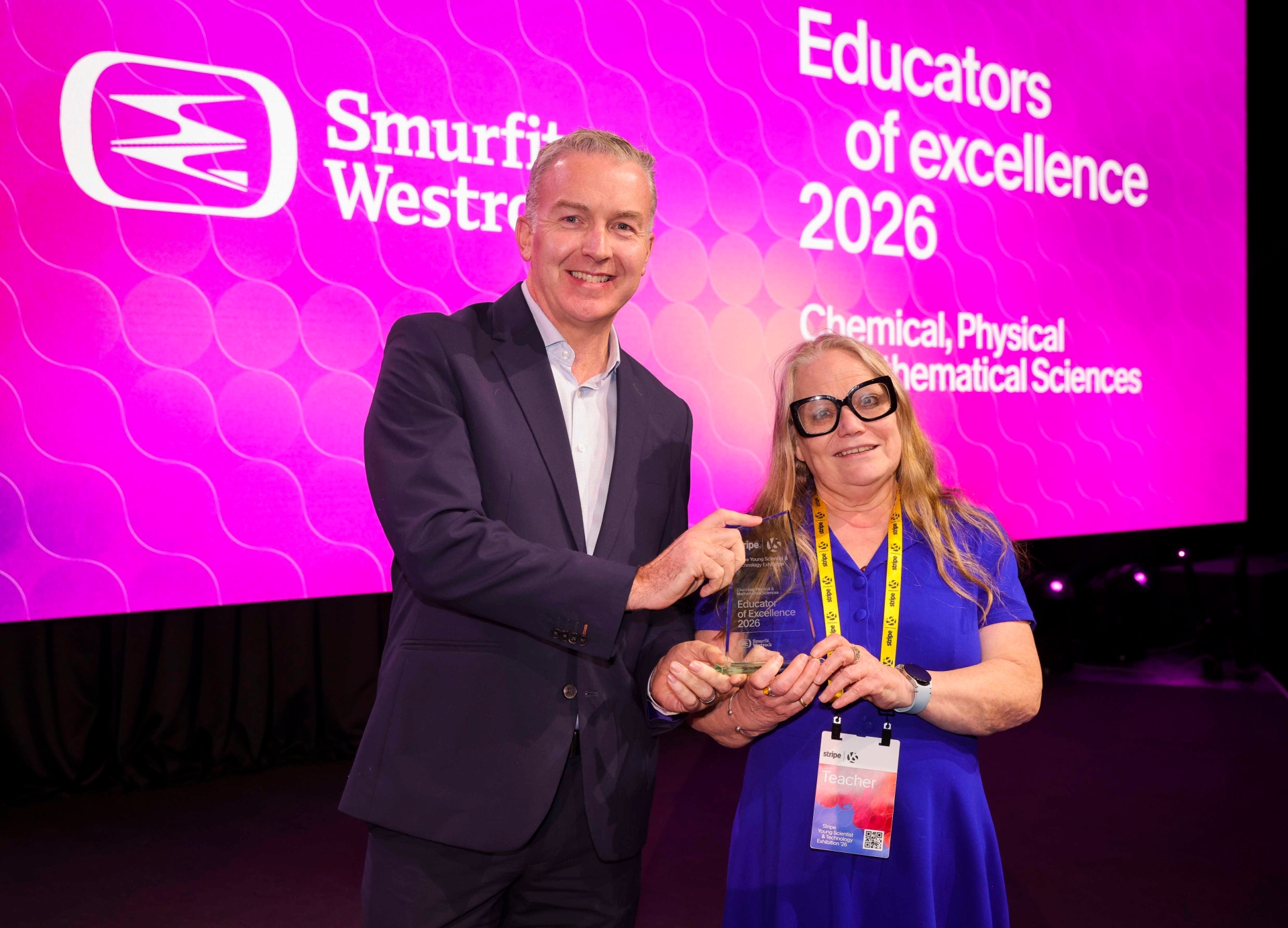 The Chemical, Physical and Mathematical Sciences Educator of Excellence Award presented by Mike Fadden, Divisional Director Ireland at Smurfit Westrock to winner Ann Blanking MBE from St Mary's College at The Stripe Young Scientist & Technology Exhibition 2026 Awards. (Photos: Fennell Photography)
