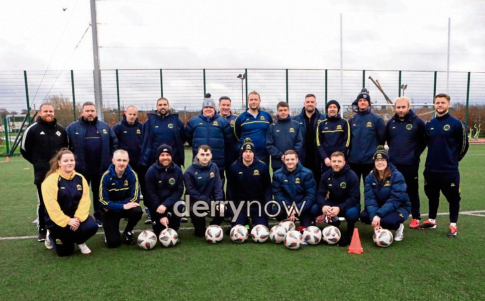 IFA coach Ronan O’Donnell facilitator with Don Boscos coaches who took part in the the IFA NCC Coaching Course at Leafair pitches.