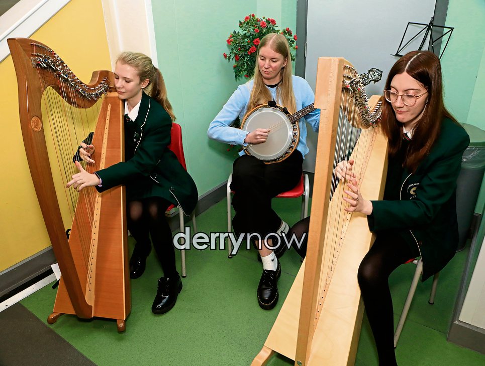 Harpist Fallon McKinney and Maeve Coyle with banjo player Shannon Duggan playing at St. Cecilia’s College Open Night.