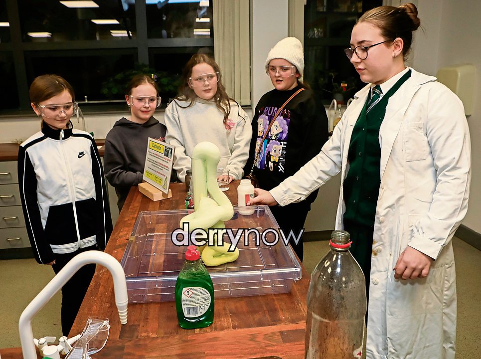 Student Kyra McGilloway with P7 pupils in the Science Department.