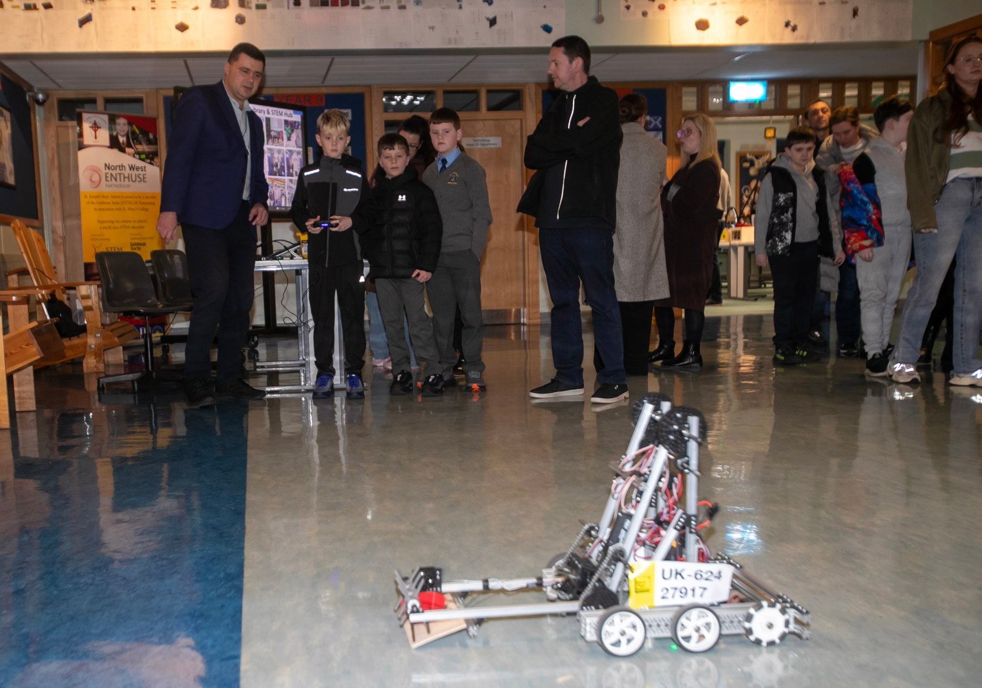 Enjoying the workings of one of the robots at St. Joseph's during Open Night.