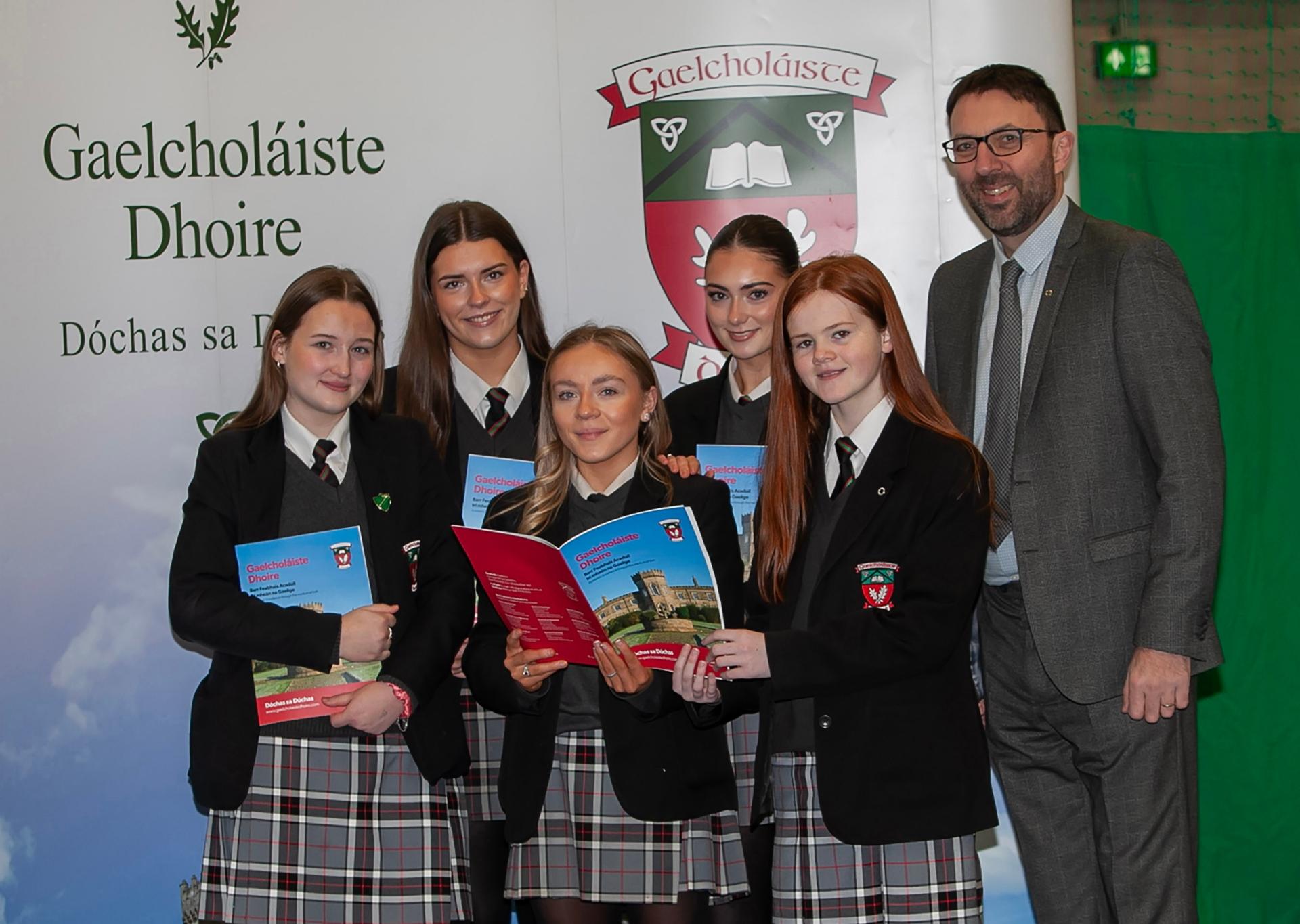 Mr. Diarmaid Ua Bruadair, Priomhoide, Gaelcholaiste Dhoire pictured with some of the students before Saturday's Open Day. (Photos: Jim McCafferty Photography)