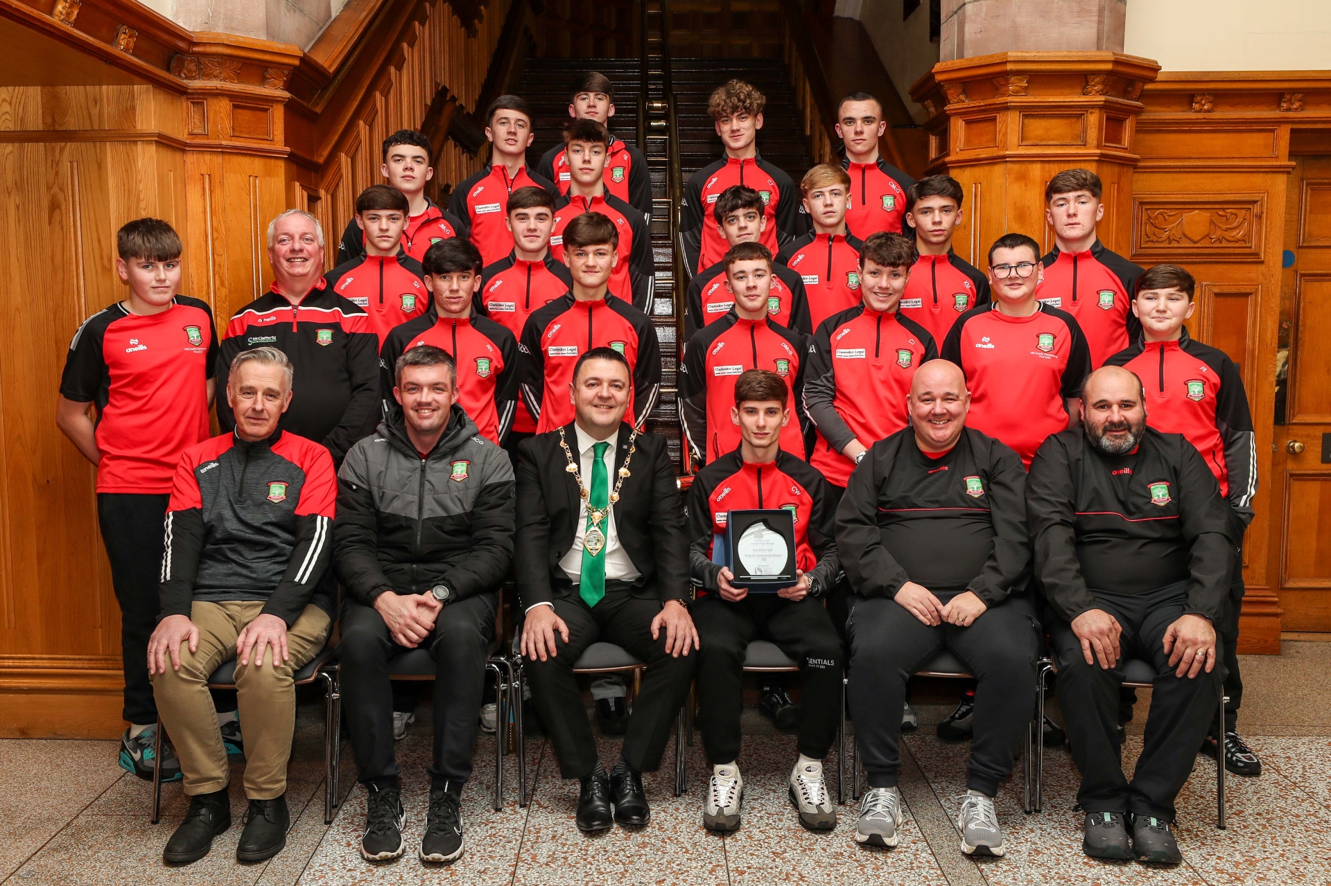 The Mayor of Derry and Strabane, Councillor Ruairi McHugh with players, management and family members at the reception. Included is Councillor Emma McGinley.