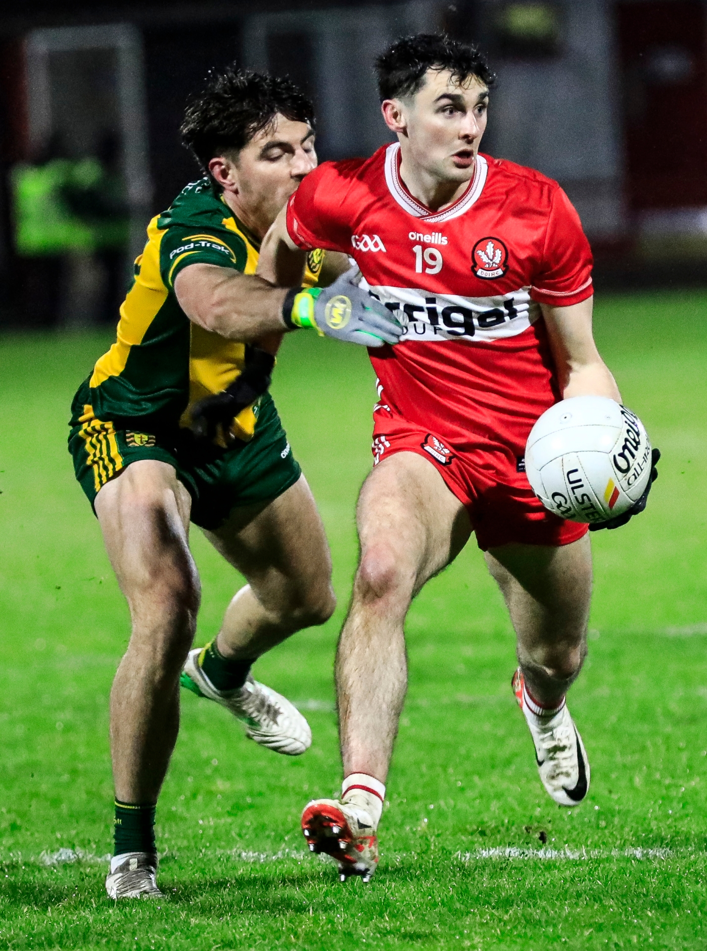 Derry's Conor McAteer pulls away from a Donegal player in the 2026 Bank of Ireland Dr. McKenna Cup semi-final at Celtic Park. (Photos - Tom Heaney, nwpresspics)