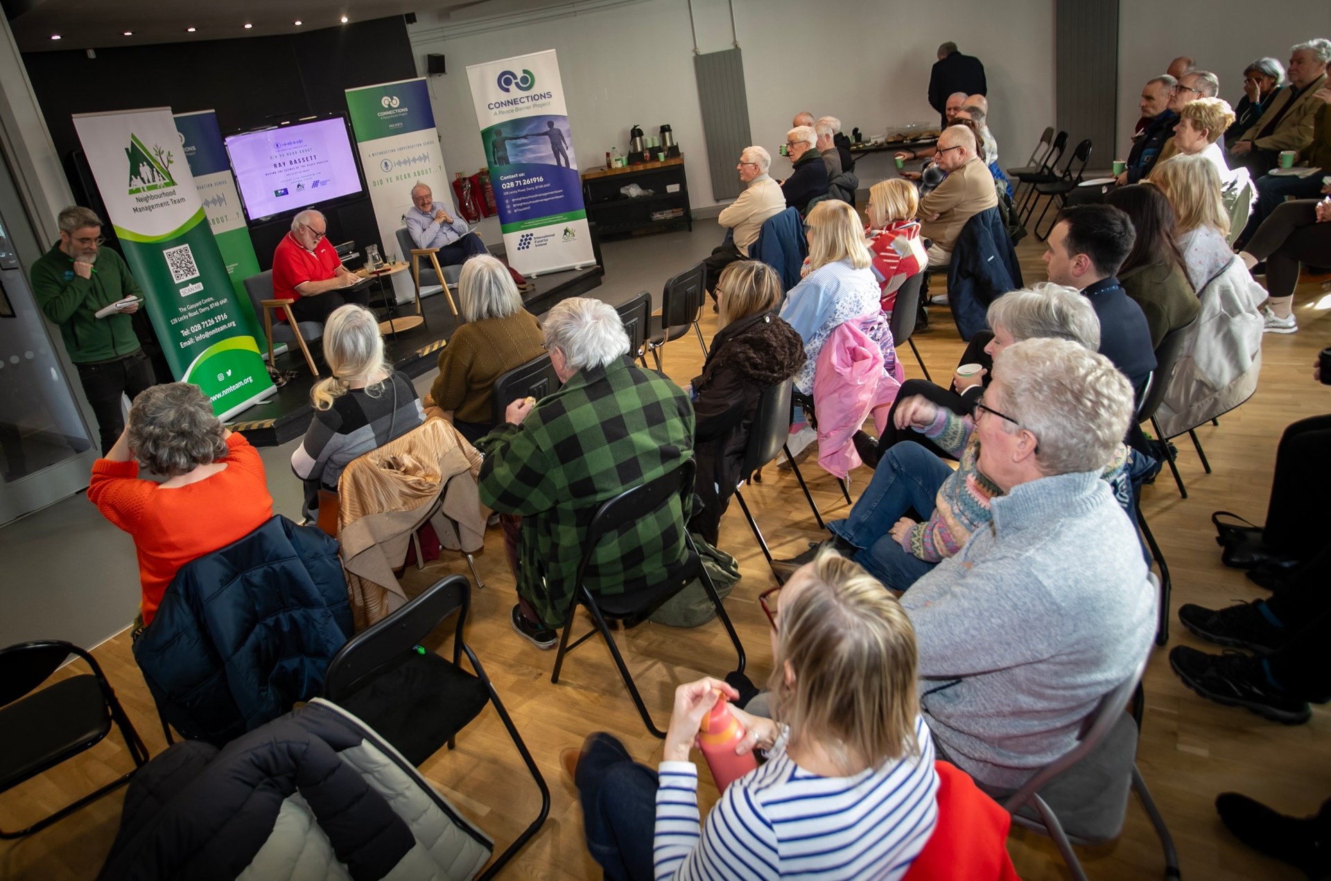 Chris McDonagh, event organiser, addresses the attendance at the start of Tuesday's 'Did Ye Hear. . . . with Ray Bassett at the Gasyard. Included is Pat McArt, chair.