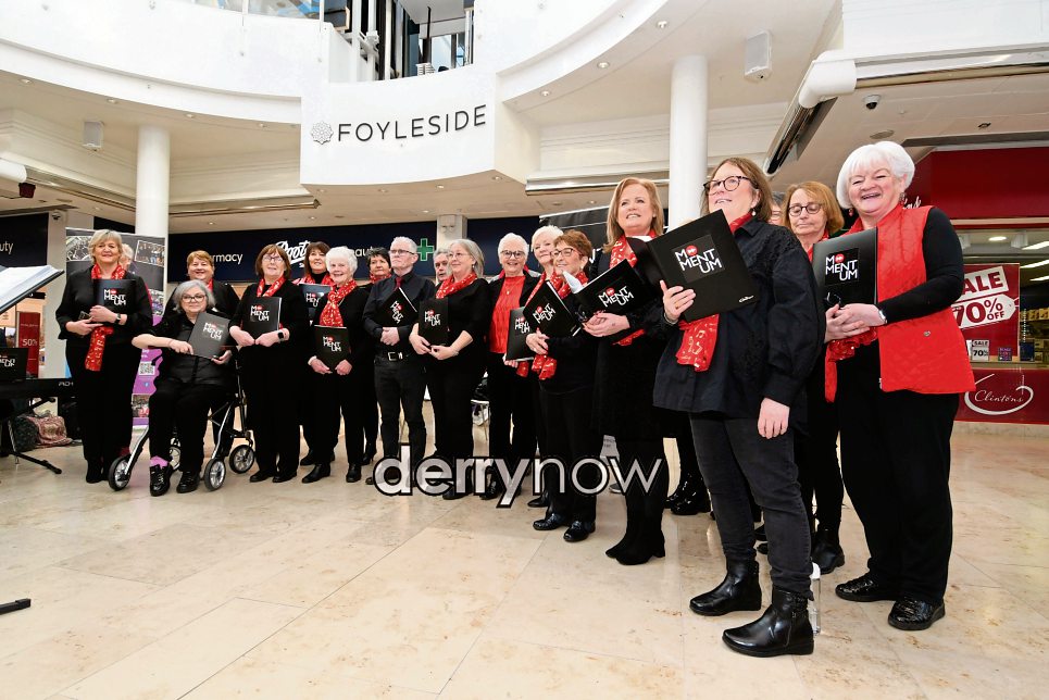 The local Momemum Community Choir which performed alongside the Just Us Choir from Enniskillen in the Foyleside Shopping Centre on Saturday.