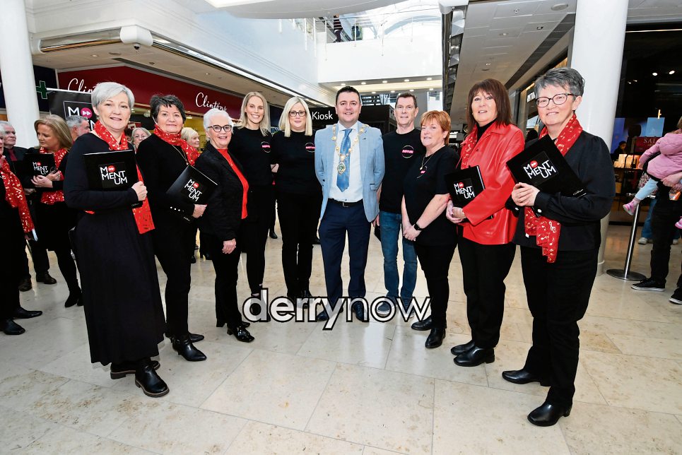 The Mayor of Derry & Strabane, Councillor Ruairi McHugh, pictured with representatives from the Just Us Choir, from Enniskillen, and the local Momentum Community Choir, when they performed in the Foyleside Shopping Centre on Saturday, from left, Lorraine Bankhead, Anne Douglas, Siobhan Heaney, Momentum Community Choir, Shelley Cowan, founder, Tracey Lucia Farry, Treasurer, Graham Kent, Chairman, Caroline Bogue, Secretary, Just Us Choir, Donna Lough and Rosemary Duffy, Momentum Community Choir. (Photos: Keith Moore)