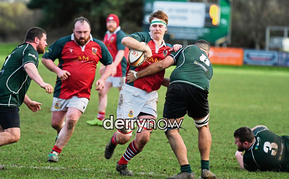 City of Derry player Isaiah Morris gets to grips with Larne's Steven Dickey at Judges Road on Saturday.