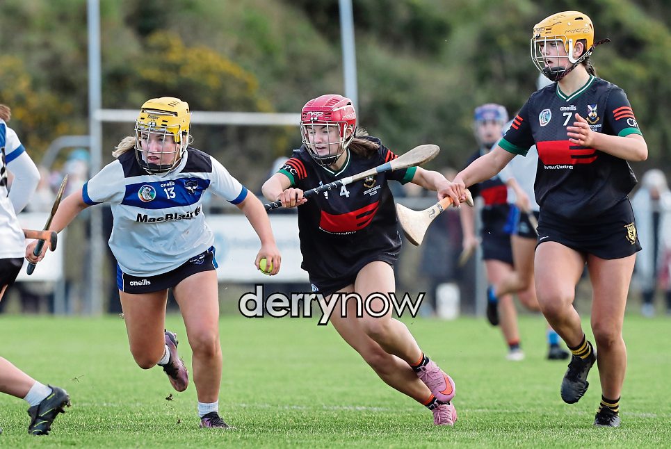 St Patrick's College, Maghera Aoibheann McLoughlin with Micha Cunning and Fiadh Sands of Cross and Passion College, Ballycastle during the Corn Uan Uladh Final.