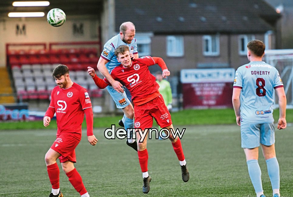 Institute defender Graham Crown wins the ball during Saturday's match against Dundela. (Photos: Keith Moore)