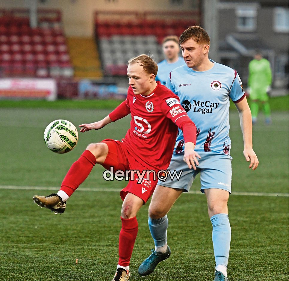 Dundela player Joshua Andrews shields the ball from Insitute's Stephen Doherty.