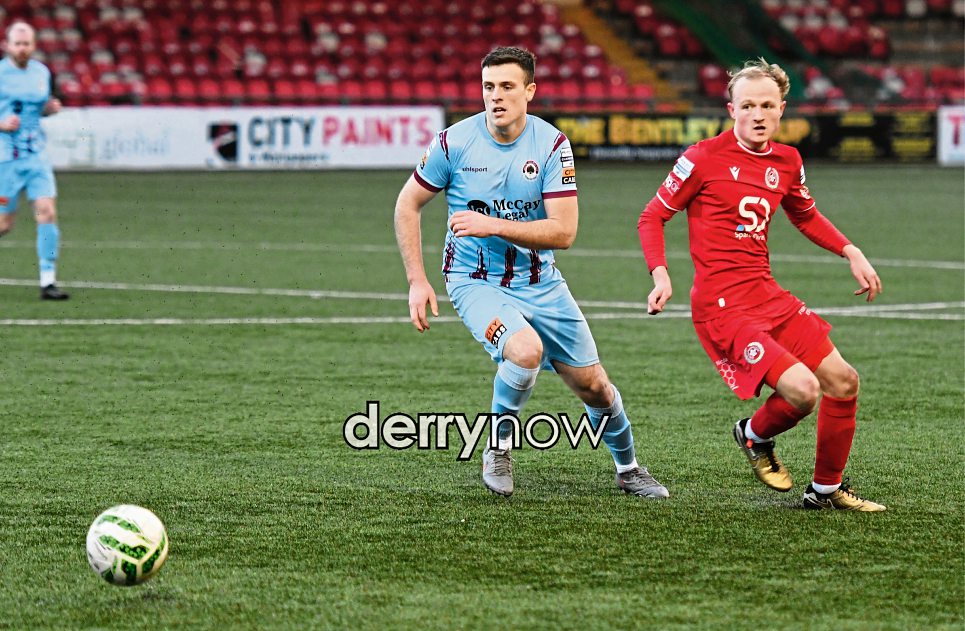 Institute goalscorer Shane Boyle skips past Dundela's Joshua Andrews. (Photos: Keith Moore)