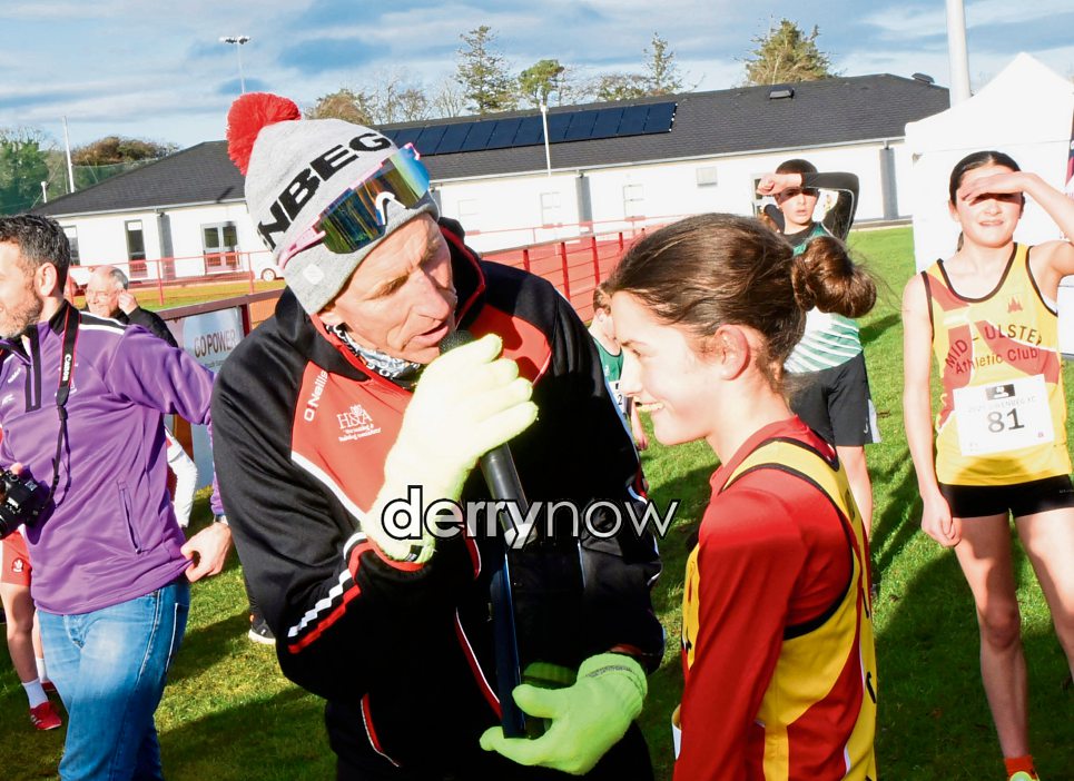 U13 Girl Síne McMullan first across the finish line with Peter Jack, Springwell RC.