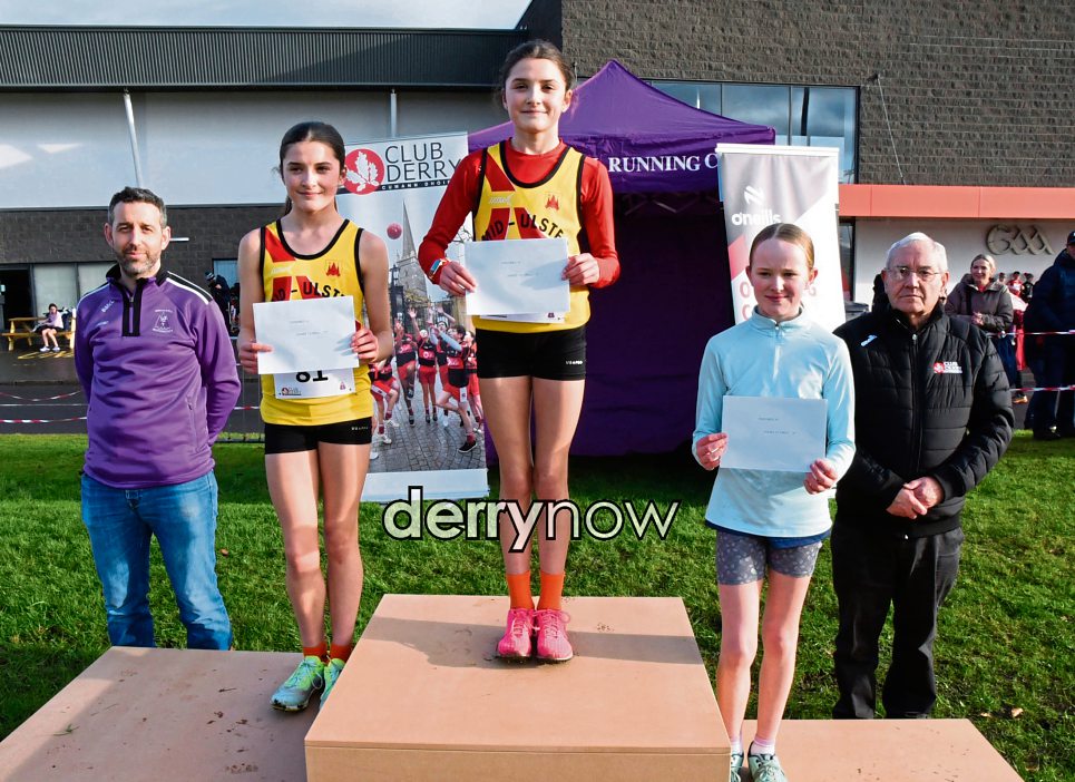 U13 Girls 1st - Síne Mc Mullan, 2nd - Saidhbhin McMullan and 3rd - Aoife Duggan with Stephen McLaughlin, Springwell RC Chairperson, and Bernie Mullan, Club Derry. (Photos - Kerrie Quinn, nwpresspics)