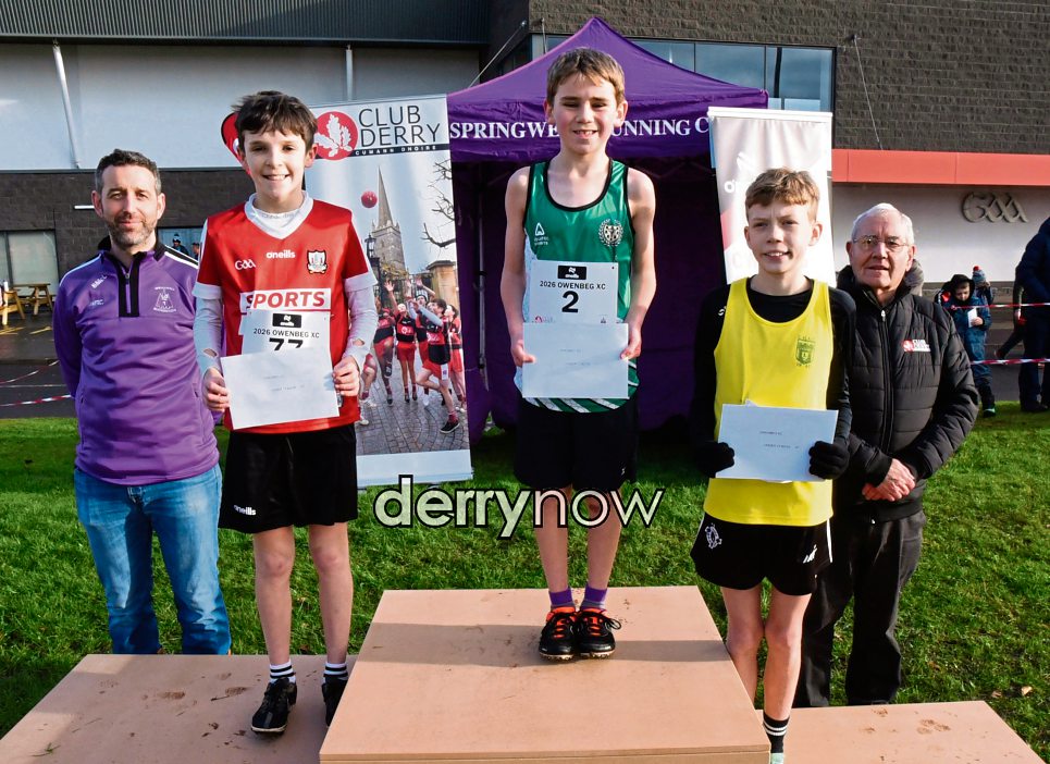 U13 Boys 1st - Jackson Nellins, 2nd - Shay McHugh and 3rd - James McKenna with Stephen McLaughlin, Springwell RC Chairperson, and Bernie Mullan, Club Derry.