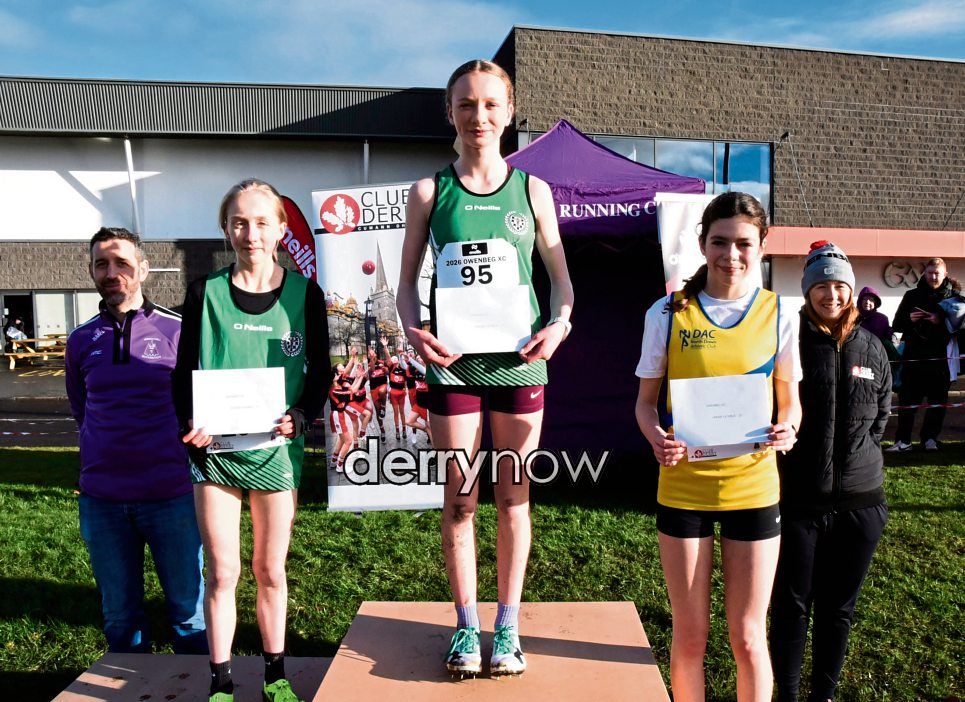 U15 Girls 1st - Clodagh McSorley, 2nd - Caitlyn Stewart and 3rd - Caitlyn Dickenson with Stephen McLaughlin, Springwell RC Chairperson, and Emma Ní Luachra, Club Derry.