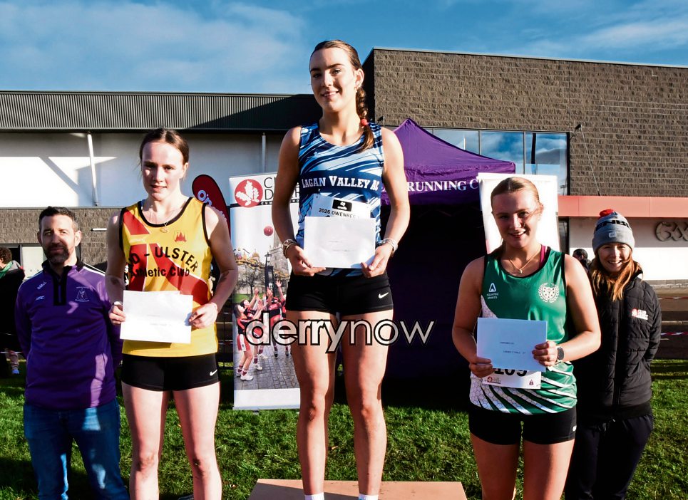 U17 Girls 1st - Katie Keown, 2nd - Grace Evans and 3rd - Sinead McSorley with Stephen McLaughlin, Springwell RC Chairperson, and Emma Ní Luachra, Club Derry.