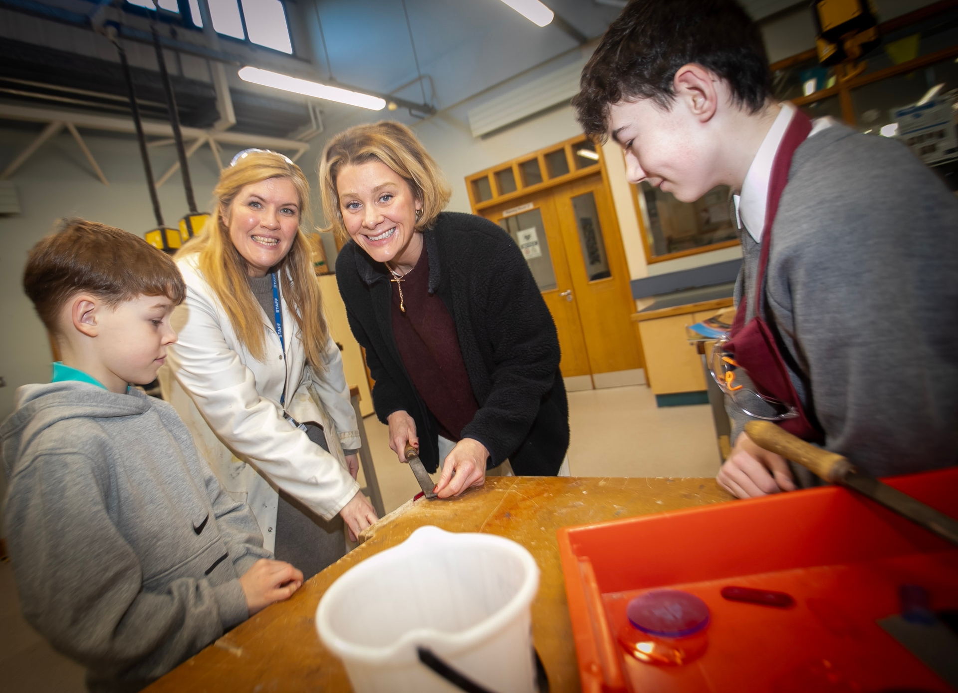 Mum Mrs. Paula Pyke shows son Sam how to file, under the watchful eye of Mrs. Emma O'Donnell and Declan Kearney.
