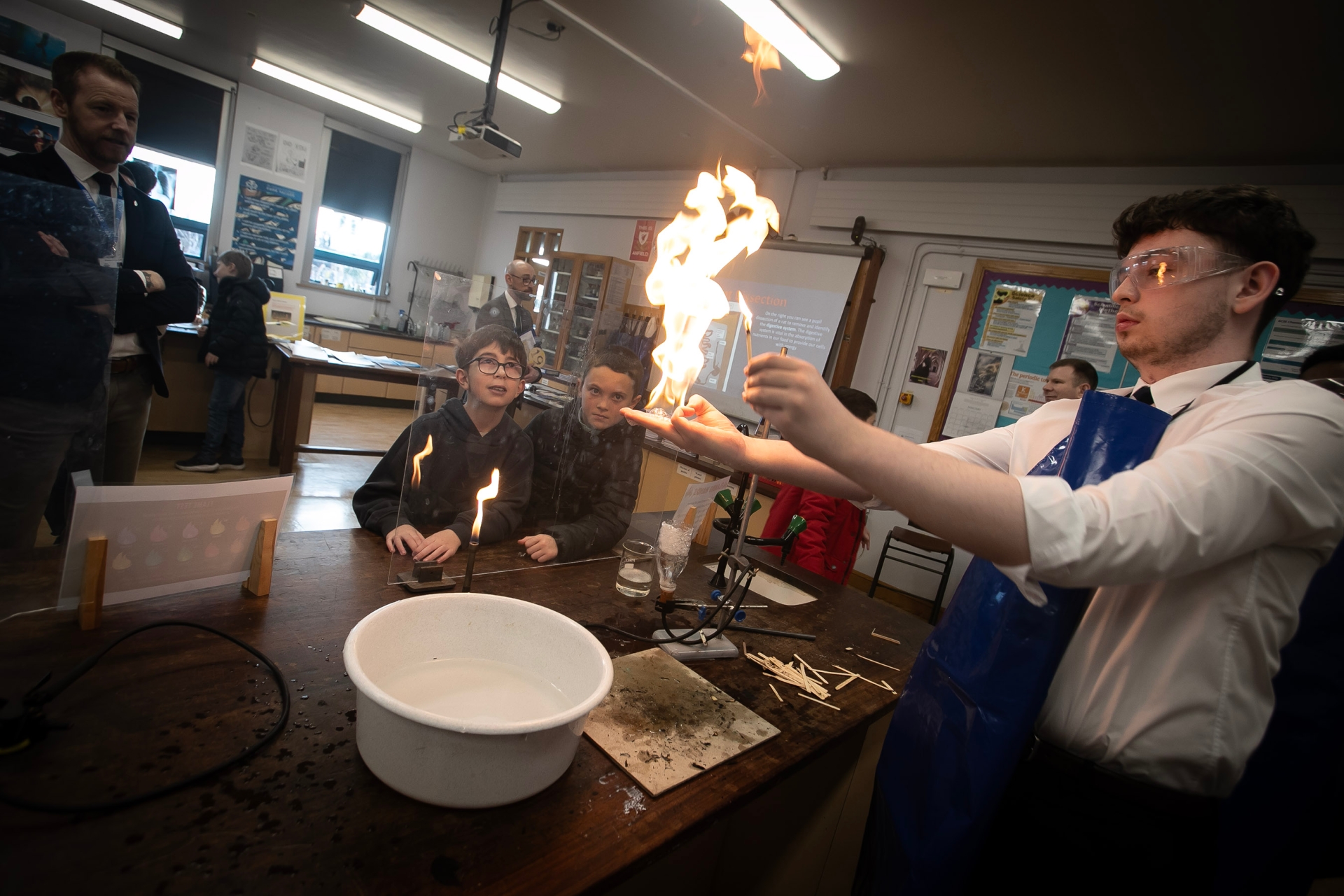 Two young pupils enjoy this 'fire experiment' during a visit to the Science Department on Saturday.