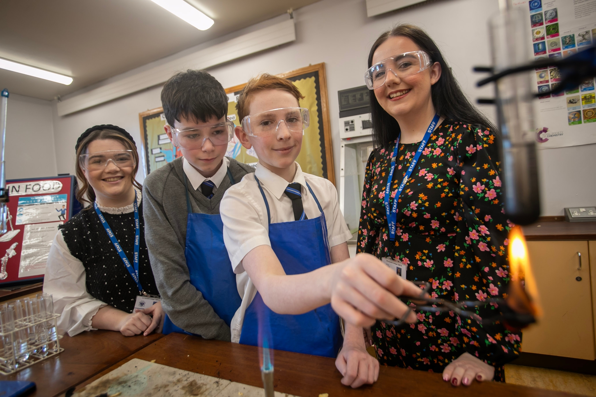 Teachers Mrs. Aine Moohan and Miss Eimera Bowerman watching as students Cormac O'Neill and Sean Toye carry out an experiment in the science lab on Saturday.