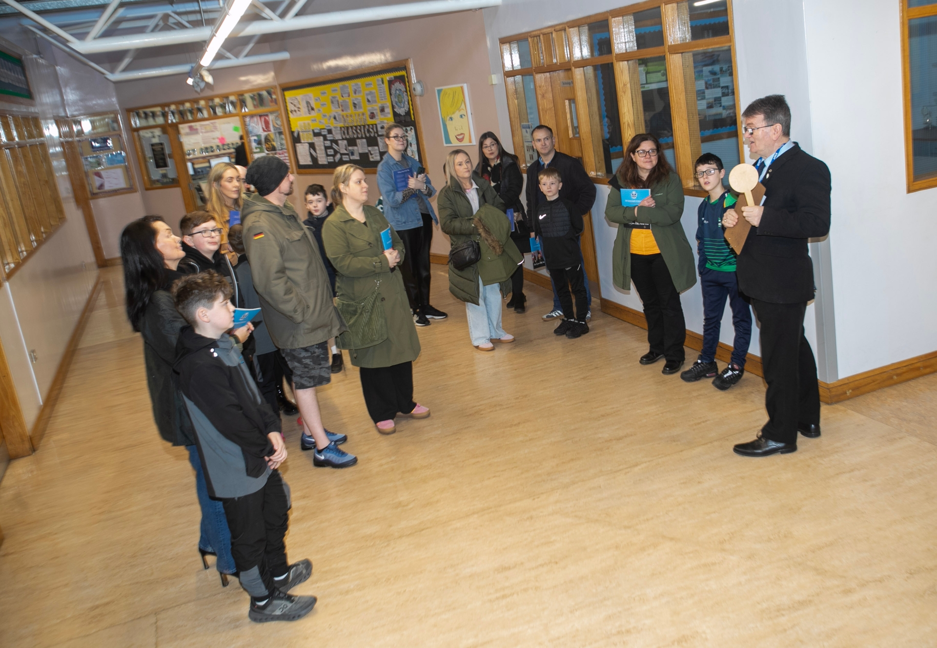 Mr. Donal Chambers, teacher, giving parents and prospective pupils a talk on the layout of the school during Open Day on Saturday.