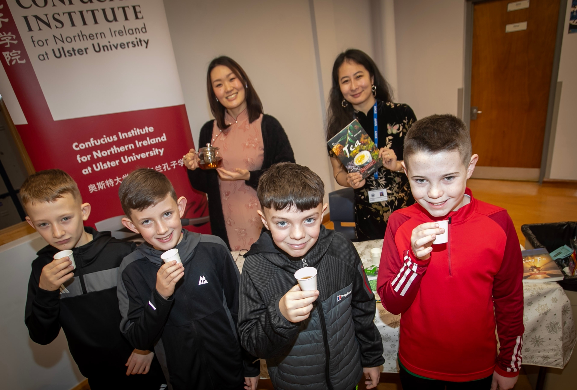 TEA TIME FOR PUPILS. . . .Checking out the quality of the Chinese tea during Saturday's Open Day at St. Columb's College.