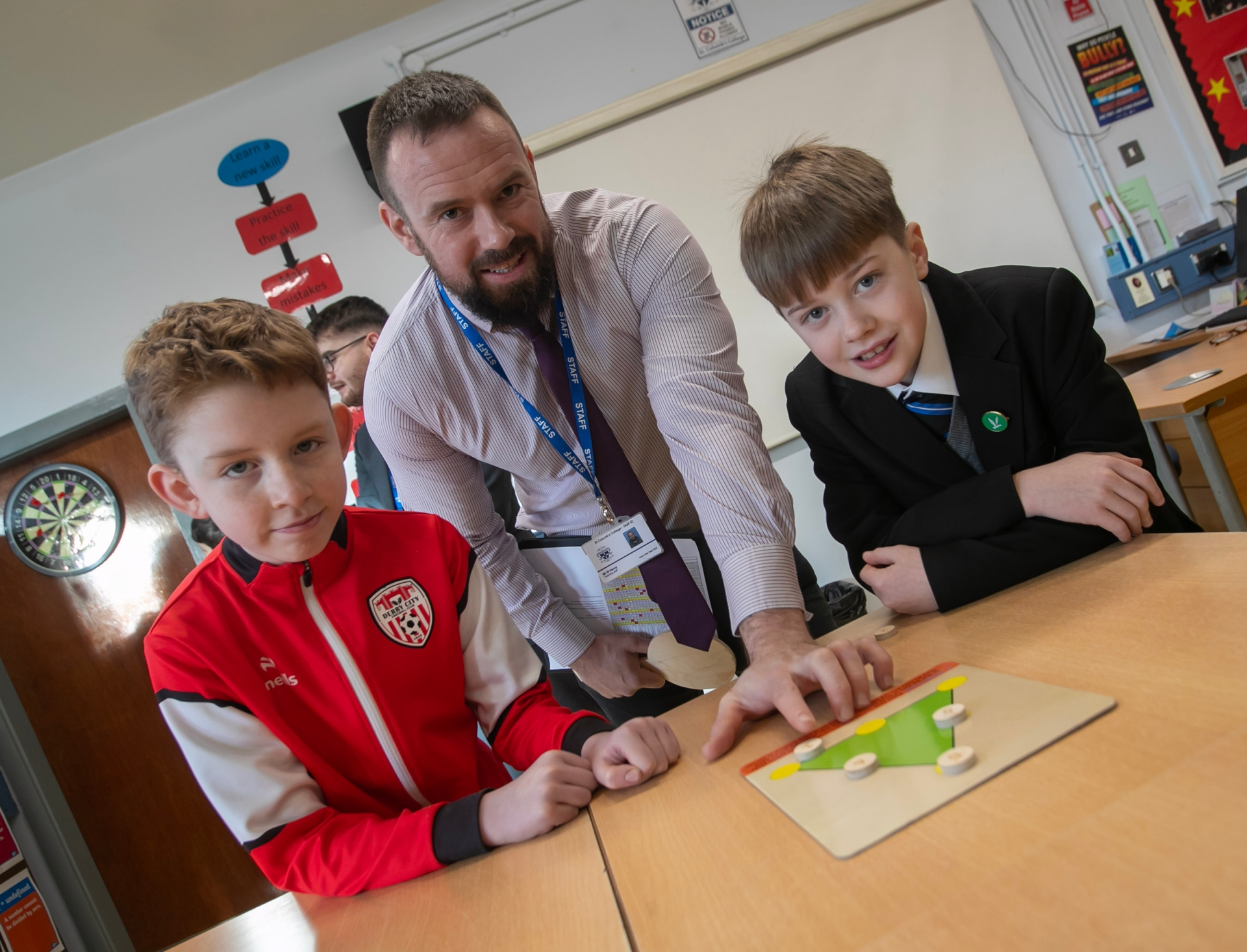 Mr. Mark Henry, Maths teacher, St. Columb's College showing how to solve the puzzle to prospective pupils Ronan Hegarty and Lucas Doherty on Saturday.