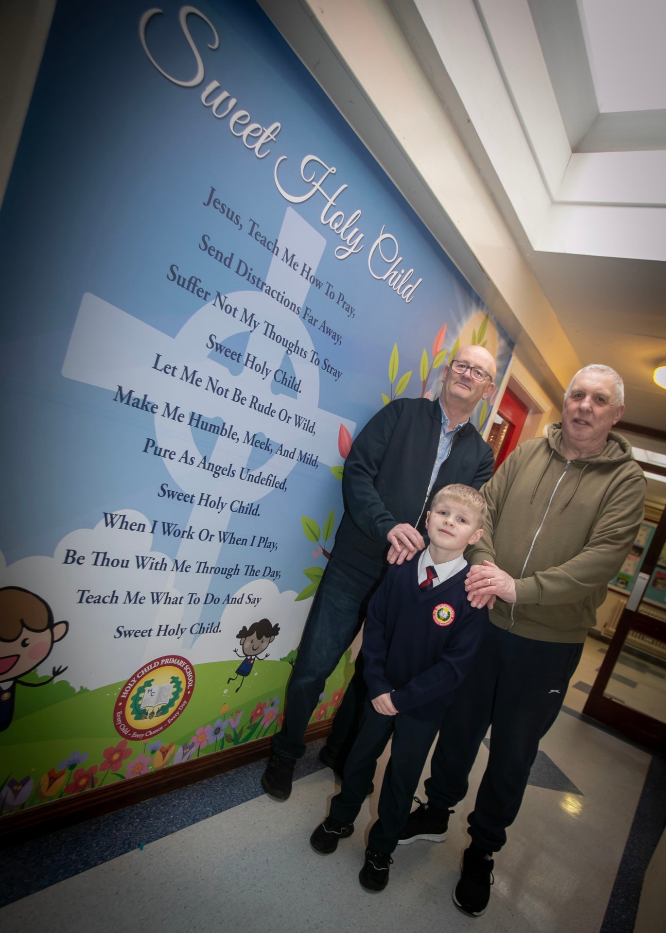 One of the very proud young pupils at Holy Child PS pictured on 'Grandparents To School' Day on Wednesday with his two grandads. (Photos: Jim McCafferty Photography)