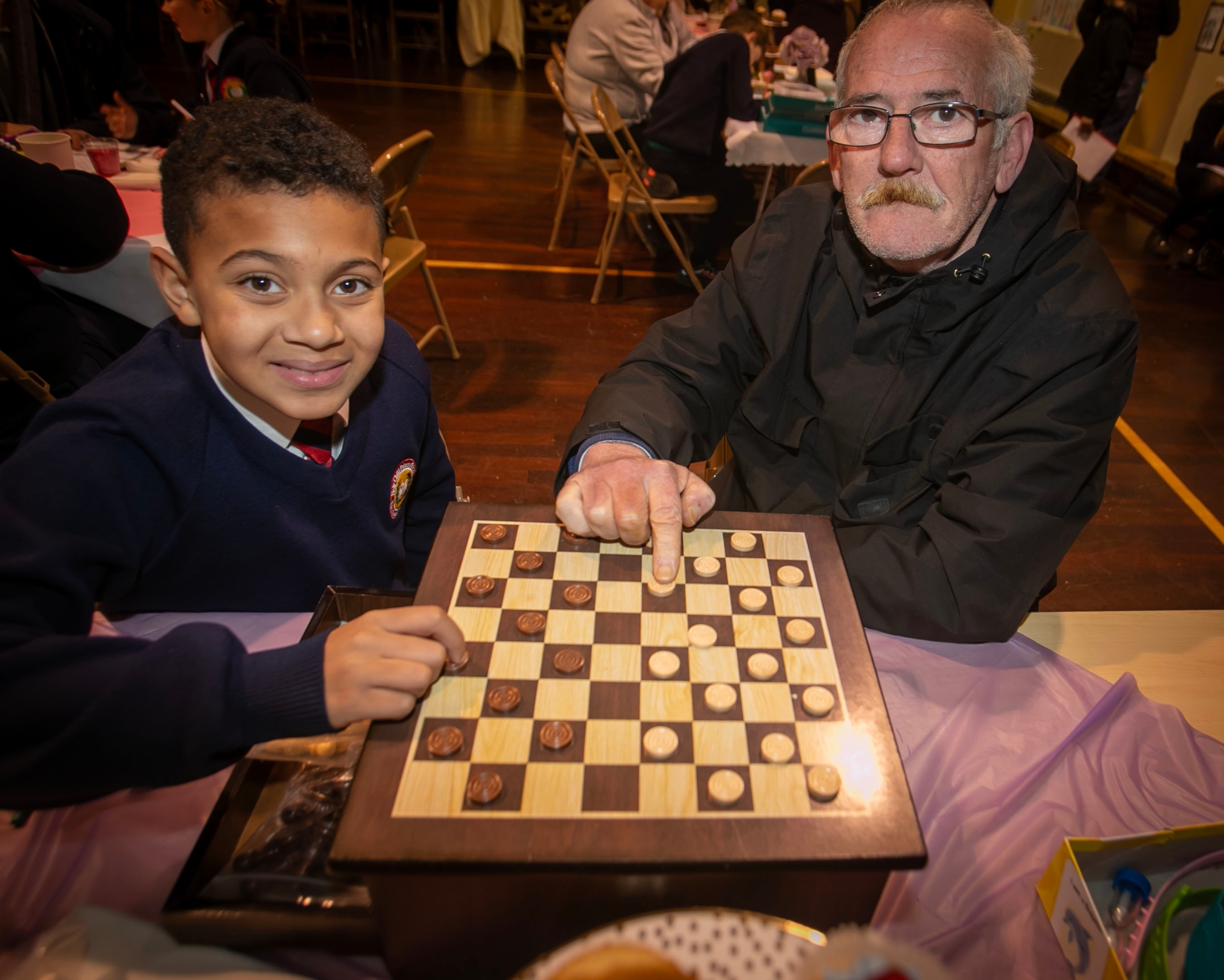 Grandad David McCleery and grandson Jordan having a game of chess on Wednesday.