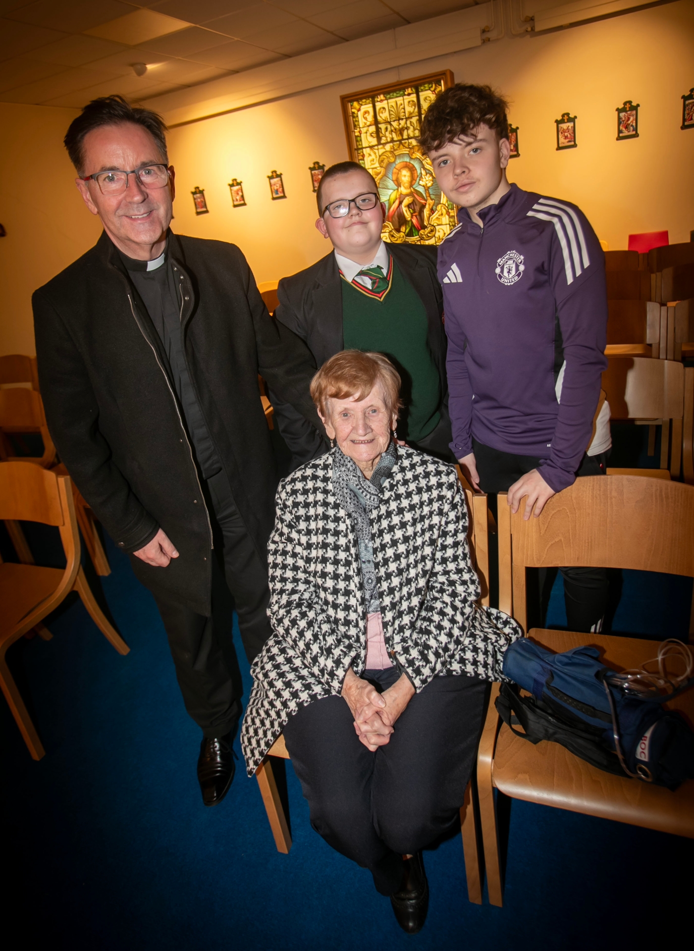 St. Joseph's Chaplain Fr. Shaun Doherty pictured with students Ben and Bobby and their grandmother.