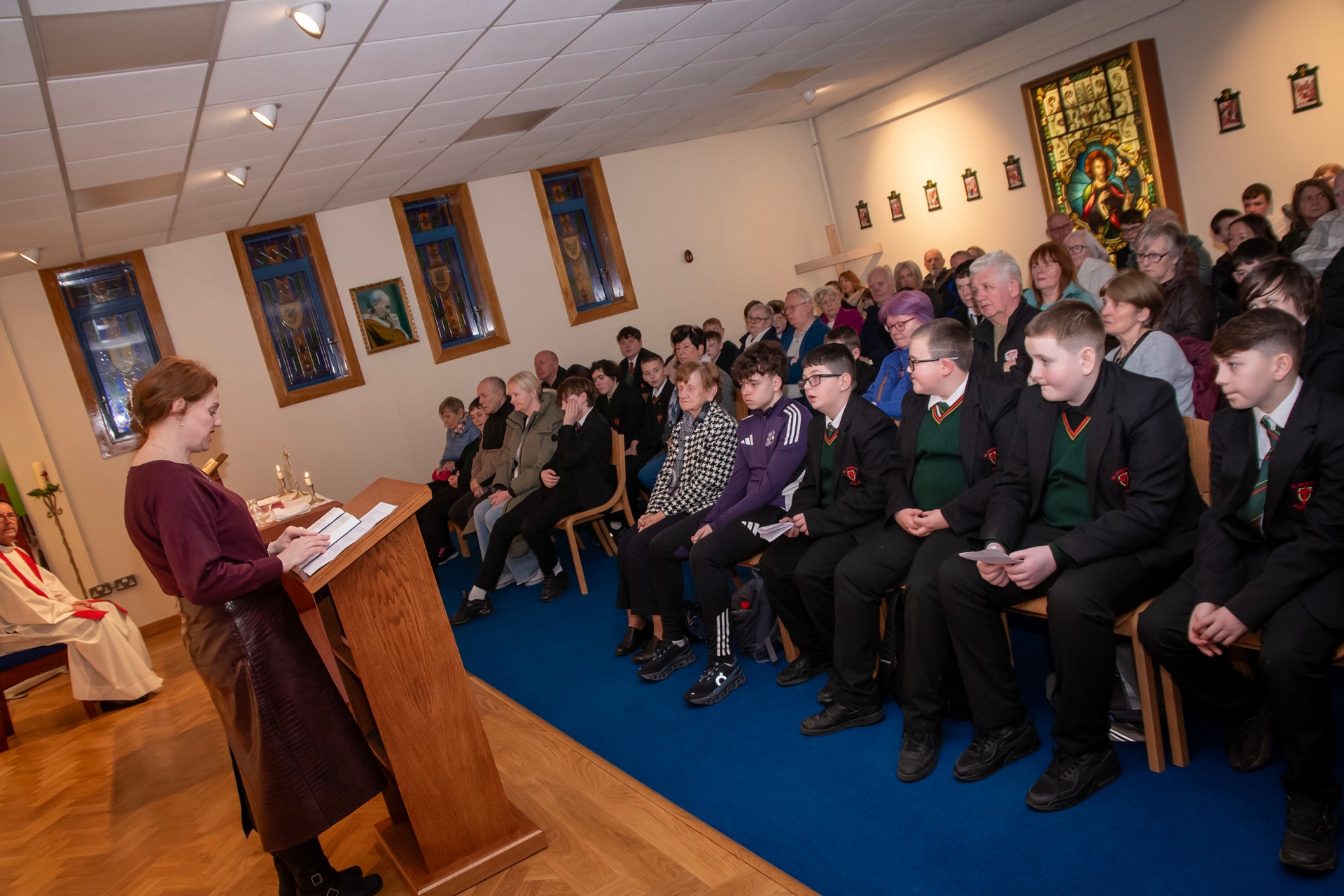 Mrs. Fiona Page, teacher, reading during Grandparents To School Mass at St. Joseph's Boys School on Wednesday.