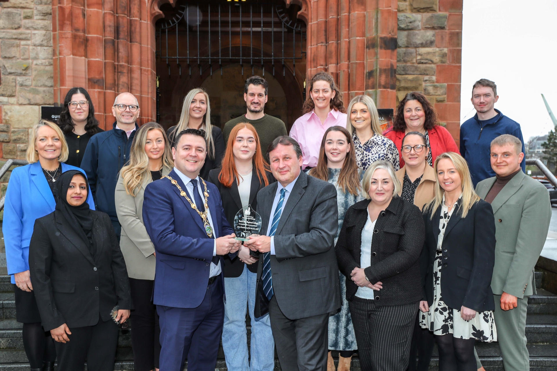 The Mayor of Derry and Strabane District Councillor Ruairí McHugh, presenting a Civic gift to Mr, Leo Murphy NWRC Principal & Chief Executive. Included are the NWRC Business Support Centre team.