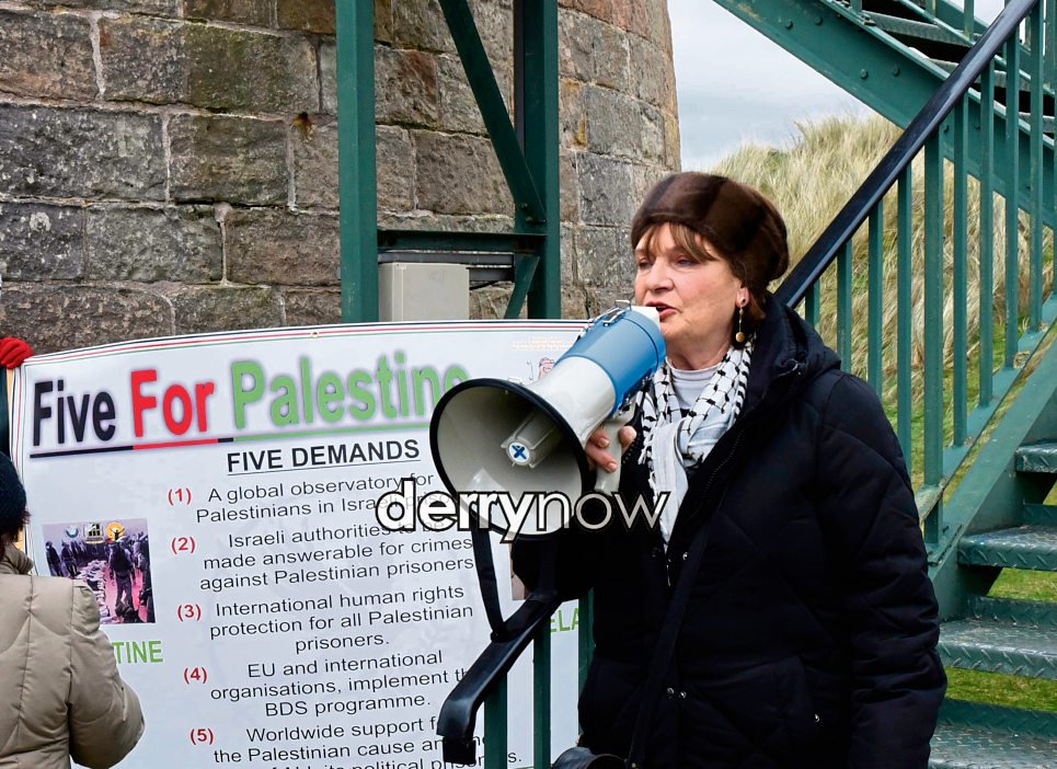 Patricia Campbell pictured at the 'Five For Palestine' Magilligan Strand protest. (Photos - Kerrie Quinn, nwpresspics)