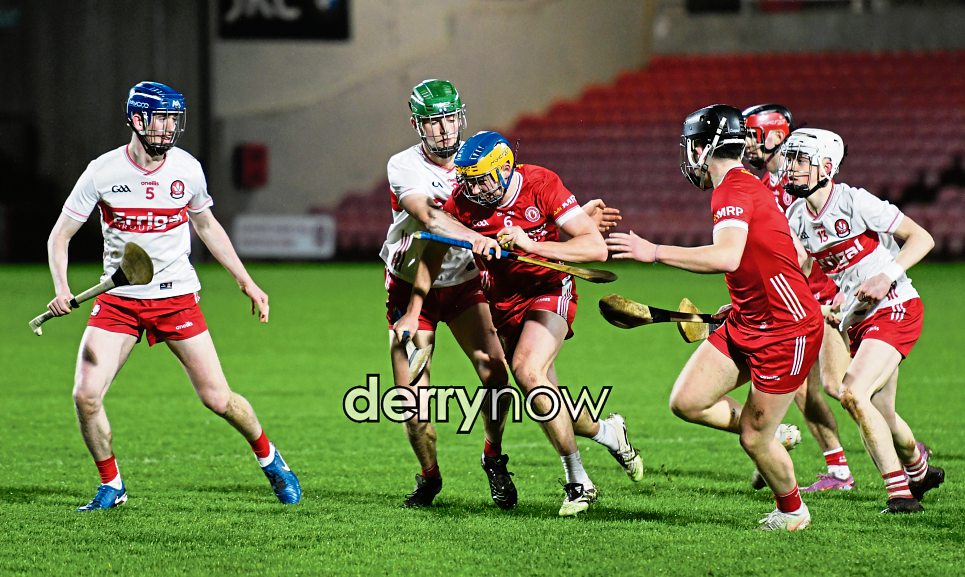 Tyrone under-20's player Sheehay Fay battles through a packed Derry midfield at Celtic Park. (Photos: Keith Moore)