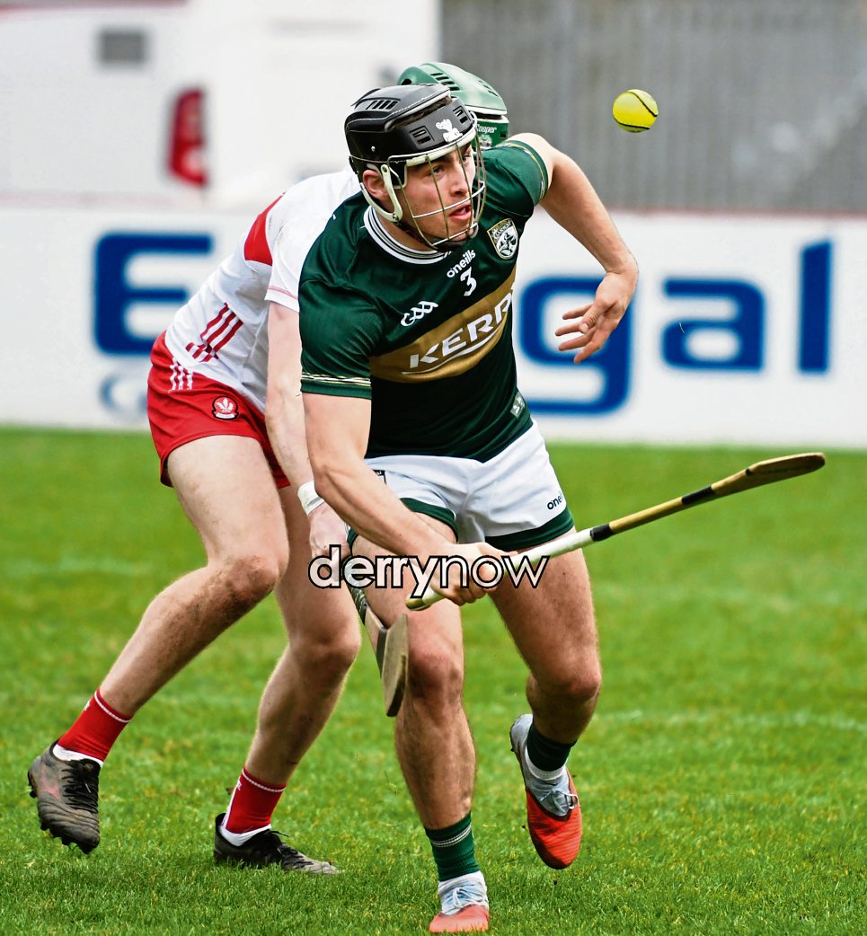 Kerry player Sean McGrath holds off Derry's Fintan Bradley.
