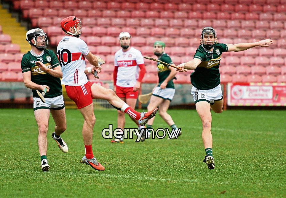 Derry's Thomas Brady fires the sliotar past Kerry defender Michael Leane.