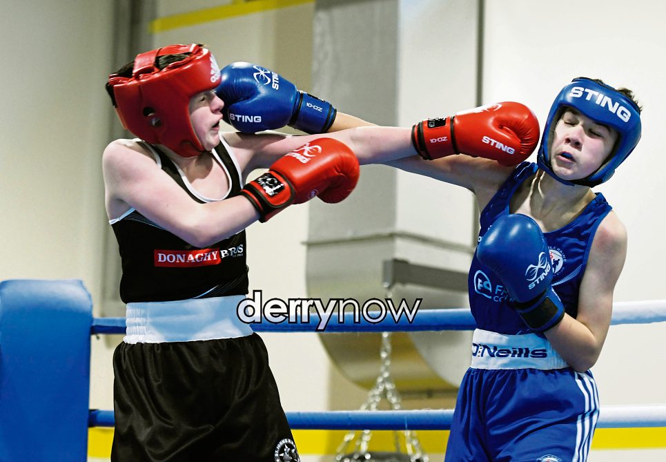 Dan Kearney, St. John's Boxing Club, and Tyler Gregg, Coleraine, exchange blows.