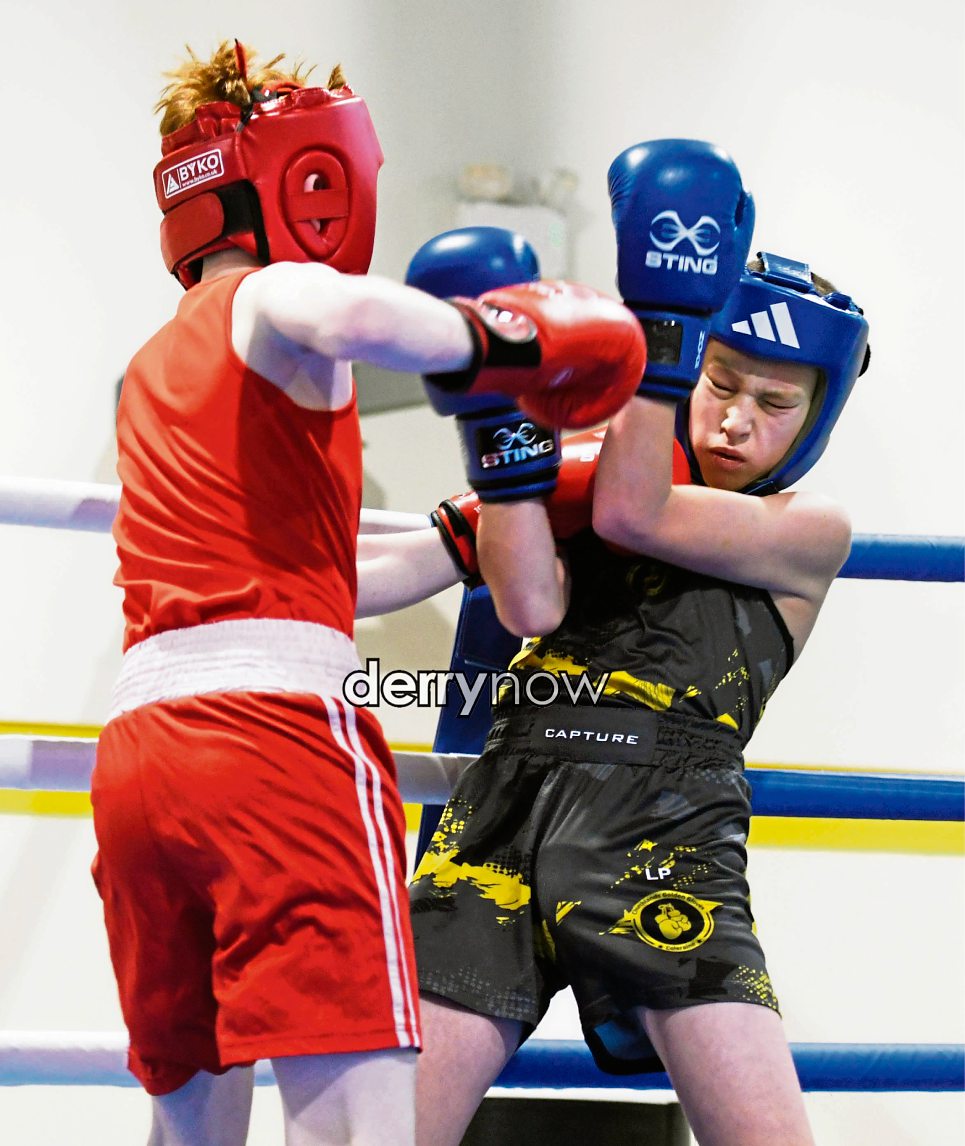 Johnny McKinney, Scorpion Boxiing Club, rocks Leon Pierzchalski, Churchlands, back on his heels.