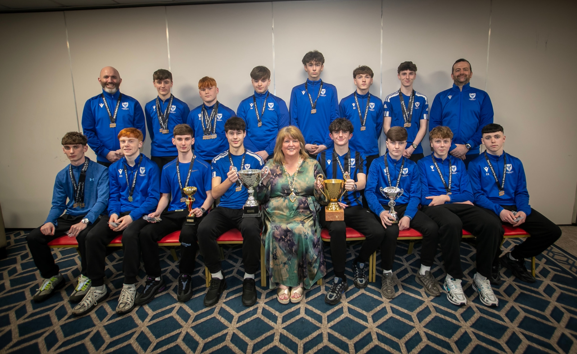 The Deputy Mayor Niree McMorris presenting Oxford United u-17s with their trophies at the Annual D&D Youth FA awards on Friday night. Included are coaches Darren Walker and Jay Cauley. (Photos: Jim McCafferty Photography)