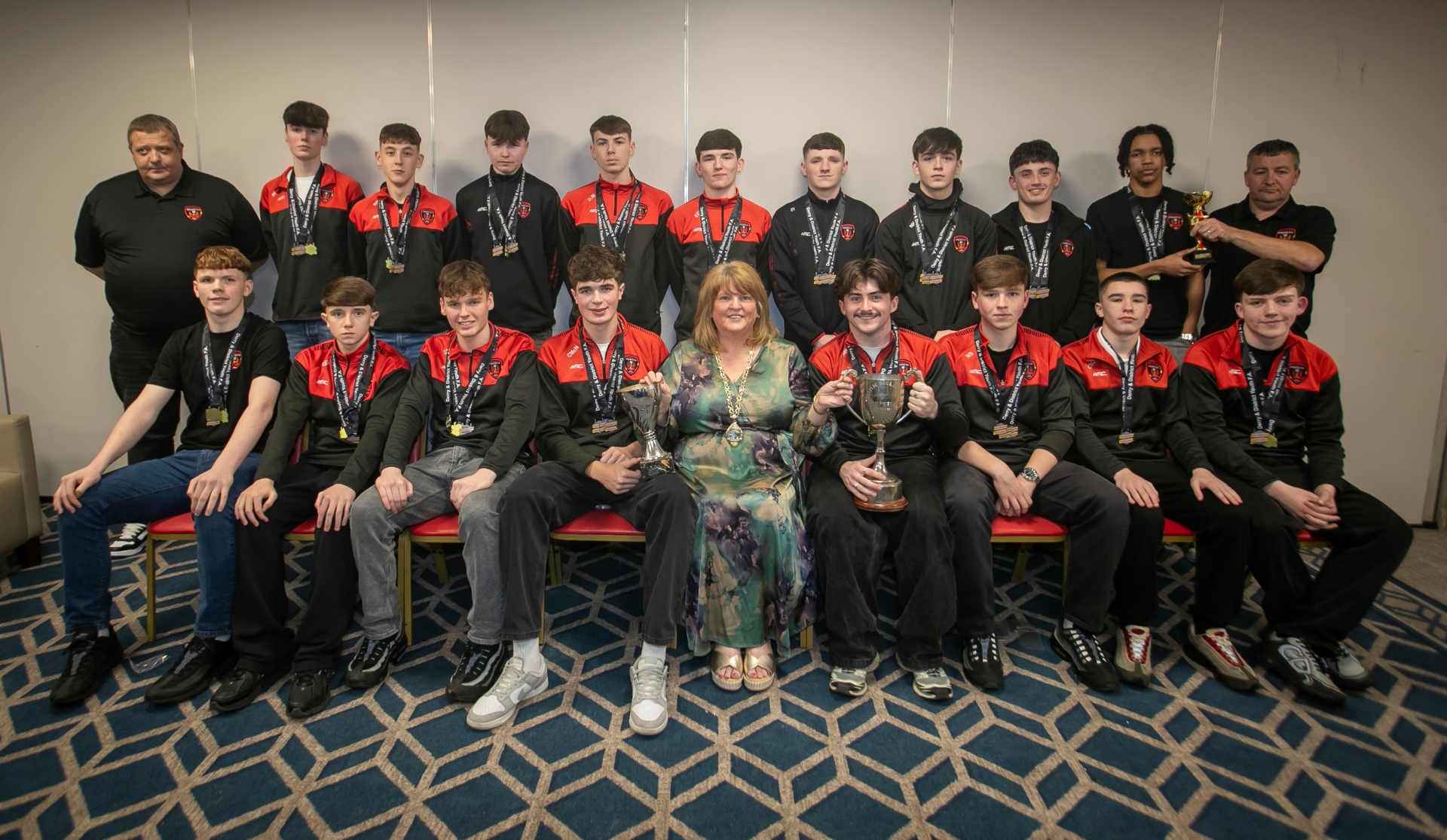 The Deputy Mayor Niree McMorris presenting Phoenix Athletic u-16s with their trophies at the Annual D&D Youth FA awards on Friday night. Included are coaches Stephen Gallagher and Barry Ward.