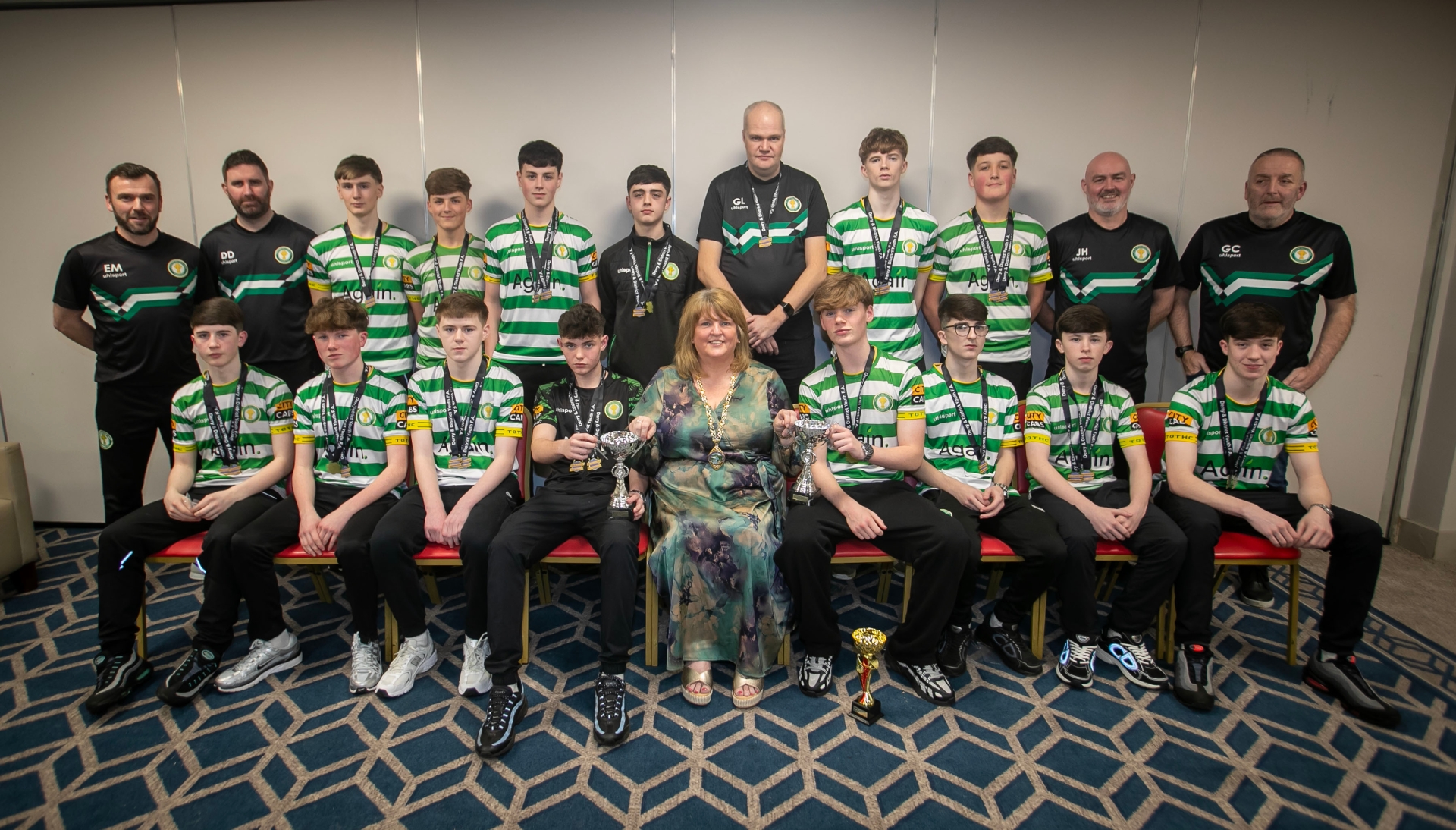 The Deputy Mayor Niree McMorris presenting Top of the Hill Celtic u-15s with their trophies at the Annual D&D Youth FA awards on Friday night. Included are coaches Eamon Morrow, Jimmy Houston, Gary Logue, Gerry Crossan and David Dunlop.