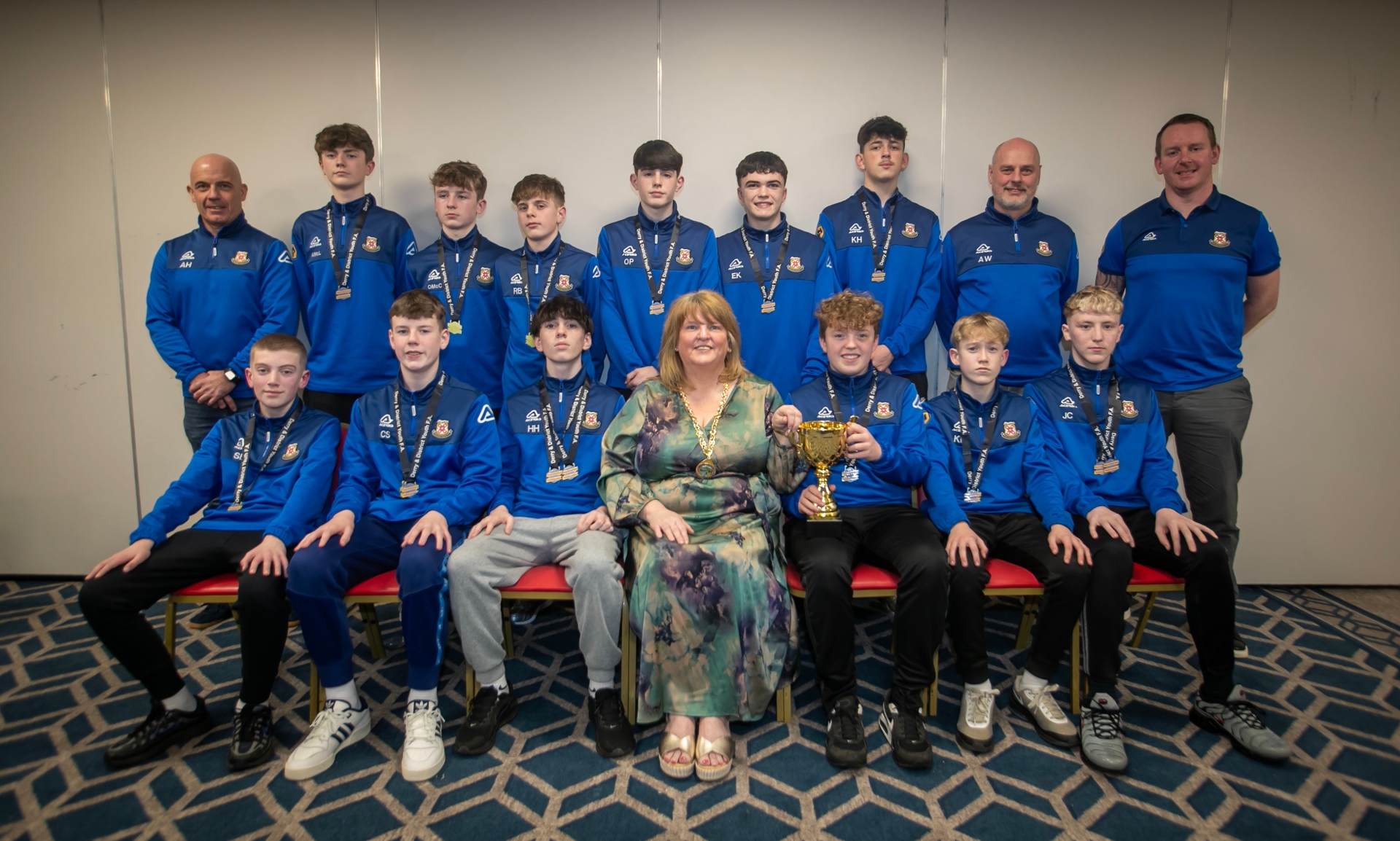 The Deputy Mayor Niree McMorris presenting Limavady United U-14s with their trophies at the Annual D&D Youth FA awards on Friday night. Included are coaches Rich Stewart, Alwyn Hunt and Ali White.