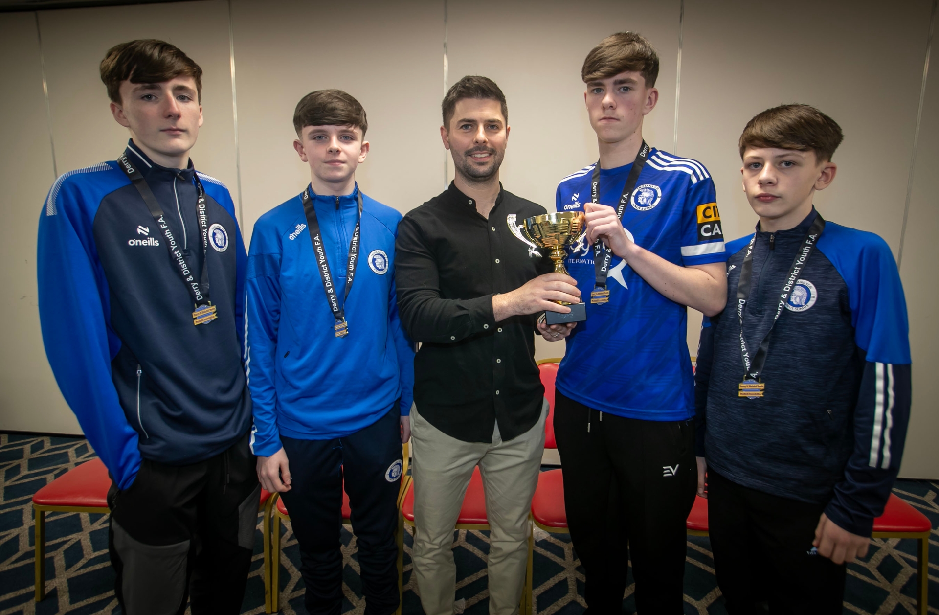 Special guest Stephen McKendry presenting representatives of the Trojans u-14 team with the Rambo Gillespie Cup at the Annual D&D Youth FA awards on Friday night. Included are coaches Rich Stewart, Alwyn Hunt and Ali White.