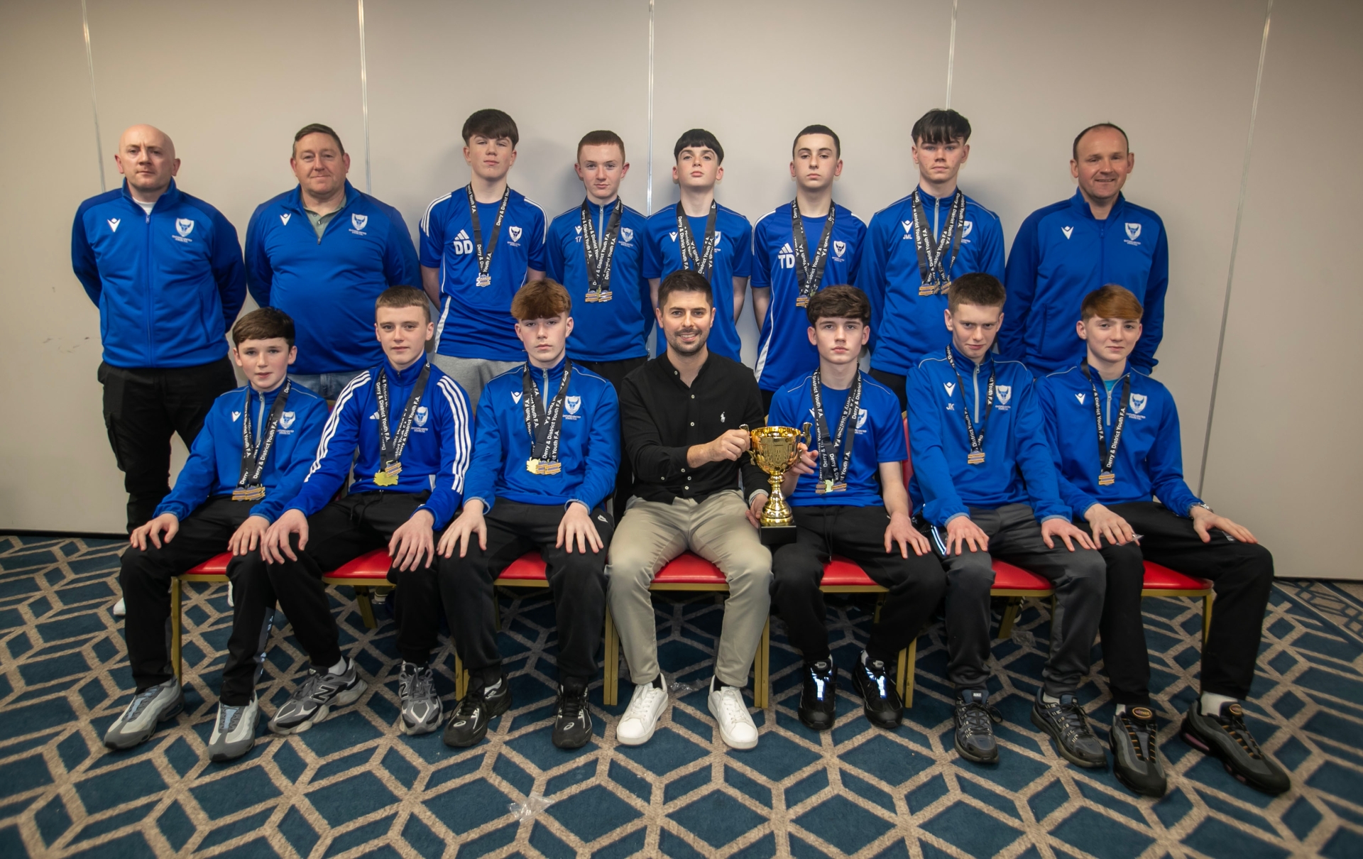 Special guest Stephen McKendry presenting Oxford United U-14ss with their trophies at the Annual D&D Youth FA awards on Friday night. Included are coaches ruairi Dalzell, Shaun Whoriskey and David McGeady.