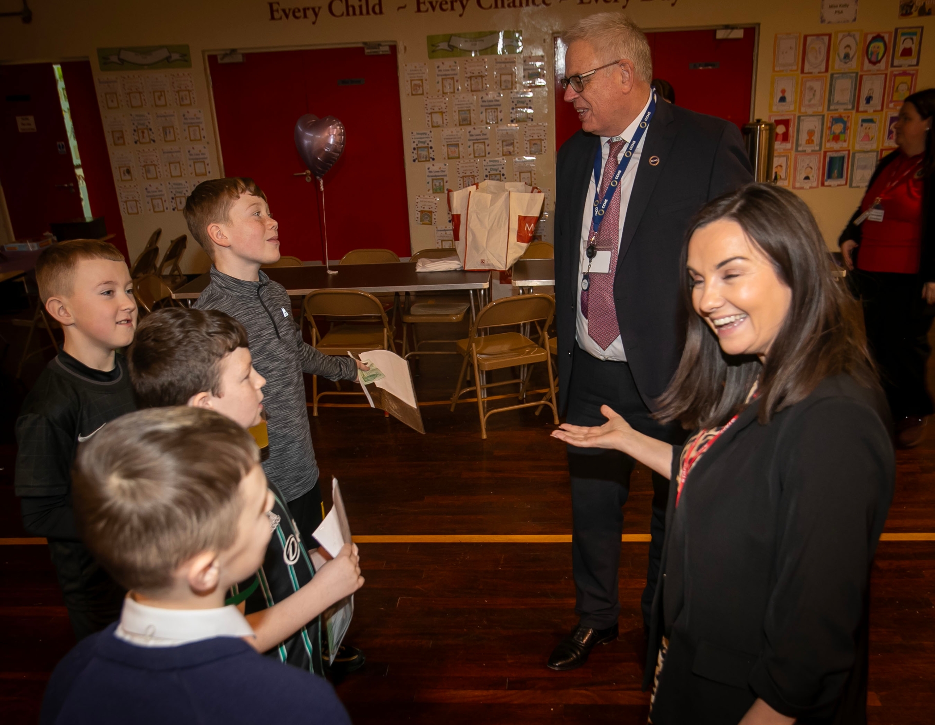 CCMS Director of Education Michael Keenan and Holy Child PS Principal, Mrs. Pat Concannon 'talking football' with some of the P7 pupils during the visit.