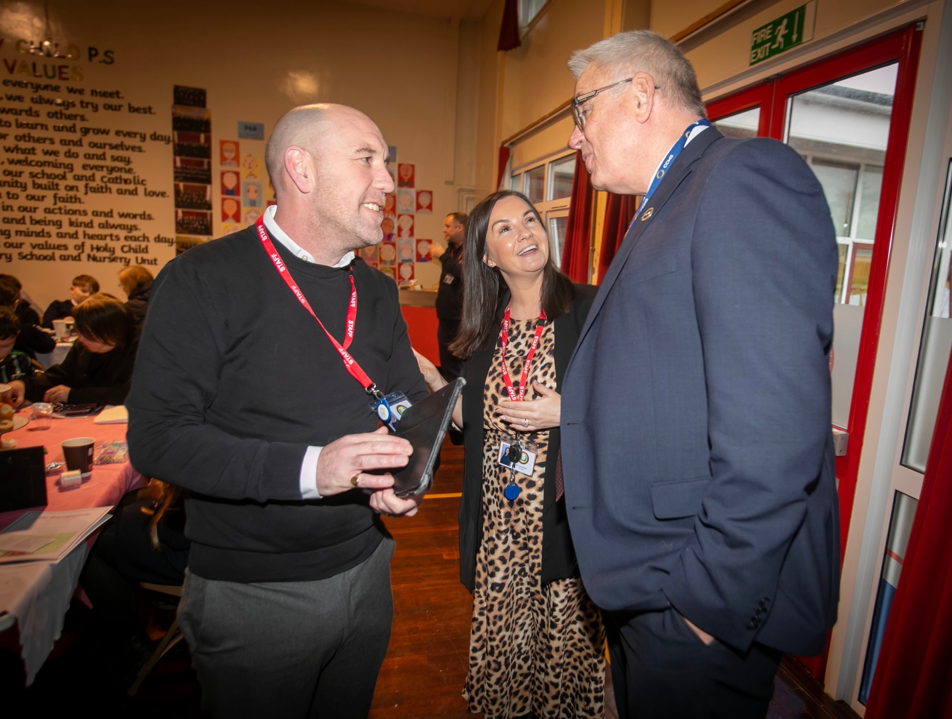 Mrs. Concannon introducing Mr. Keenan to P7 teacher Mr. David O'Donnell during Wednesday's visit. (Photos: Jim McCafferty Photography)