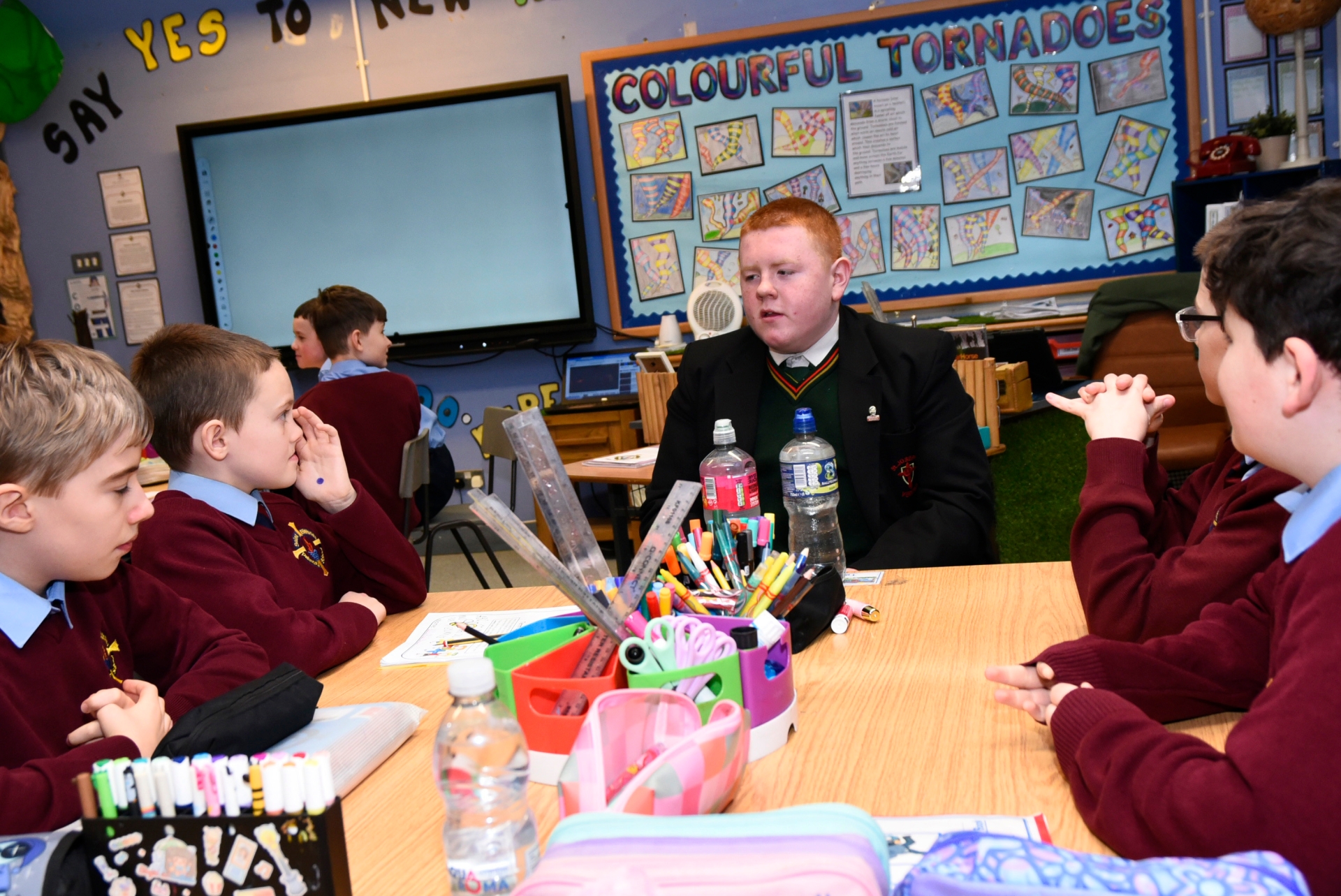 St Joseph's Boys' School student Harvey Quigley pictured with pupils from St Eithne's Primary School celebrating International Reading Day on Thursday.