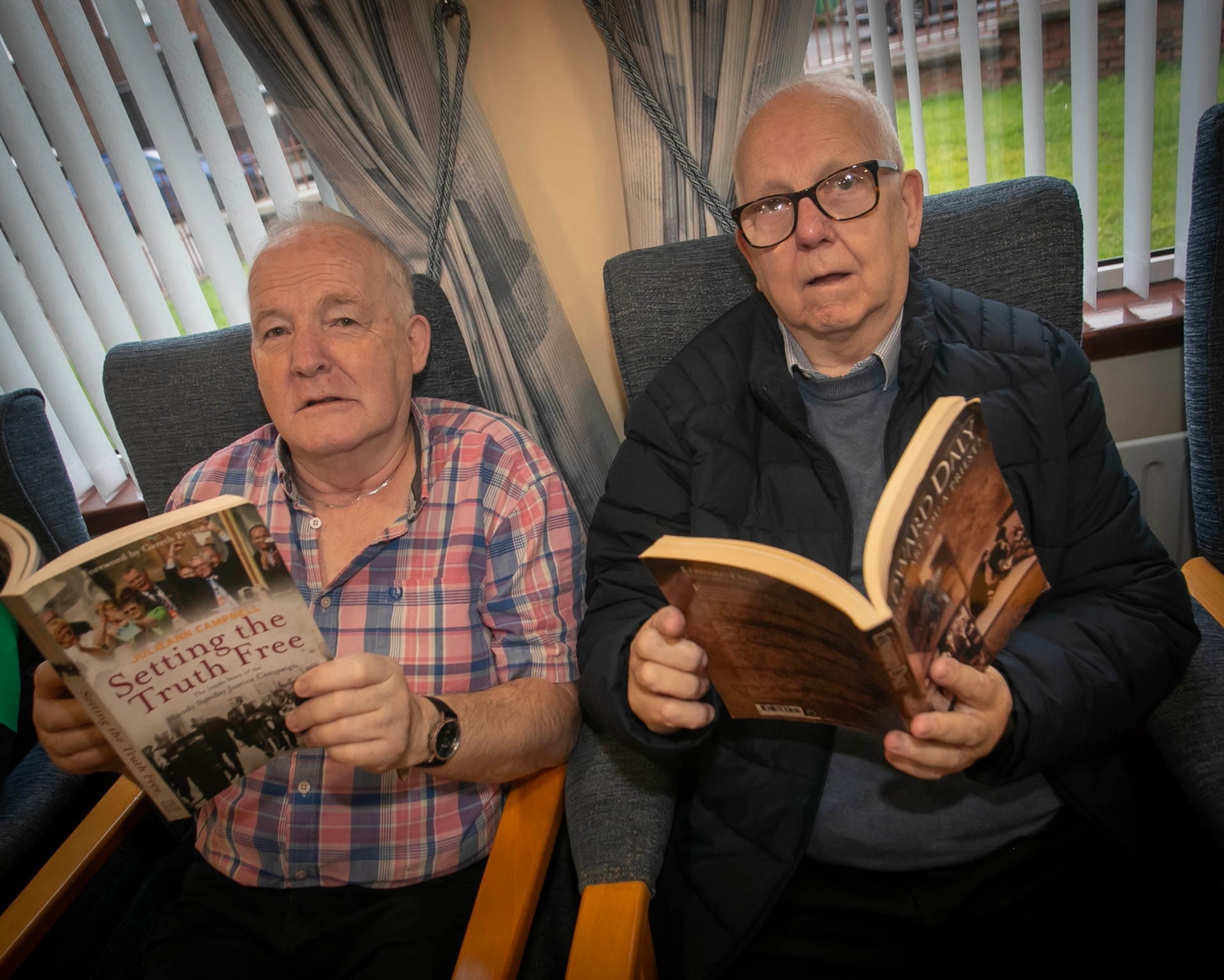 Avid readers John Coyle and Hugh McGrory showing off their choice of books on Friday at Beechwood Court.