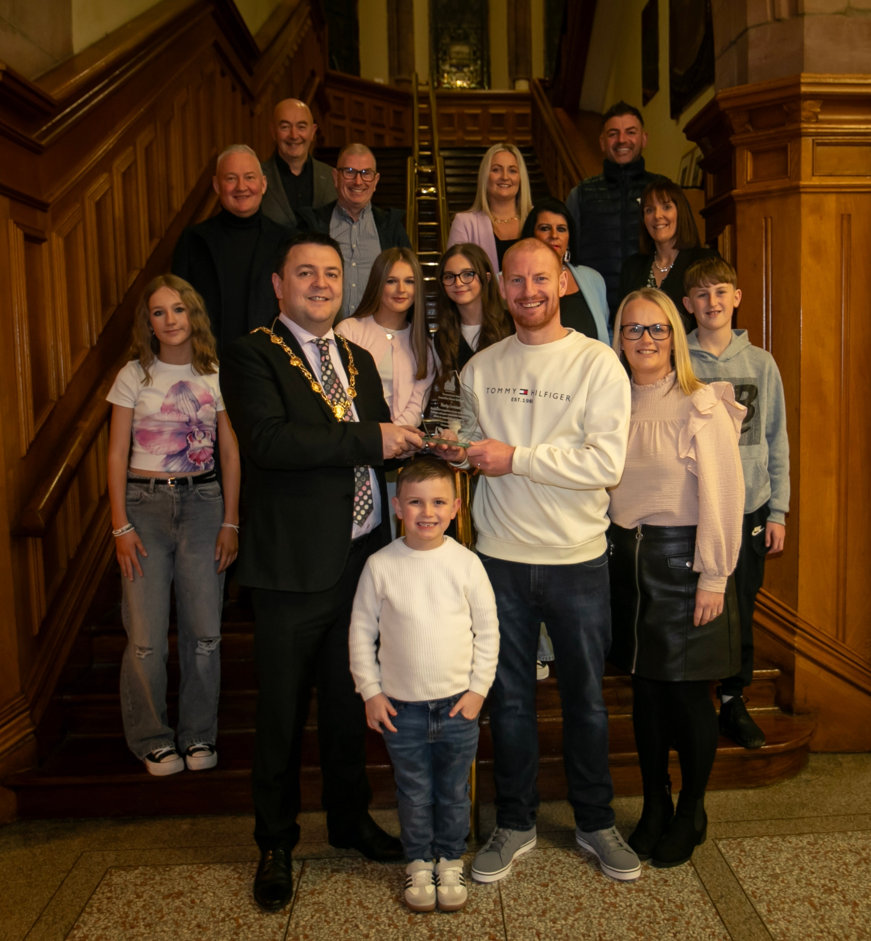 The Mayor of Derry City and Strabane District Council, Ruairi McHugh presenting Strabane man Rusty Crossan with his award on Tuesday evening at the Guildhall, Derry. The event was held to recognise Rusty's dedication and remarkable fundraising efforts in support of local charities. Included is family and friends.