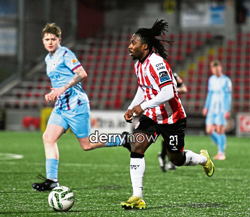 Kevin Dos Santos powers forward for Derry City during the Billy Kee Memorial match against Institute on Wednesday evening. (Photos: Keith Moore)